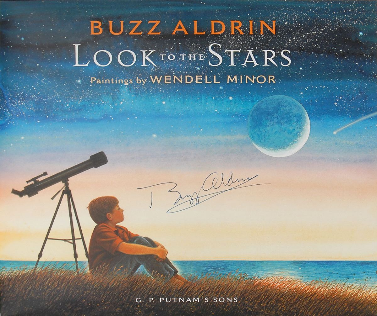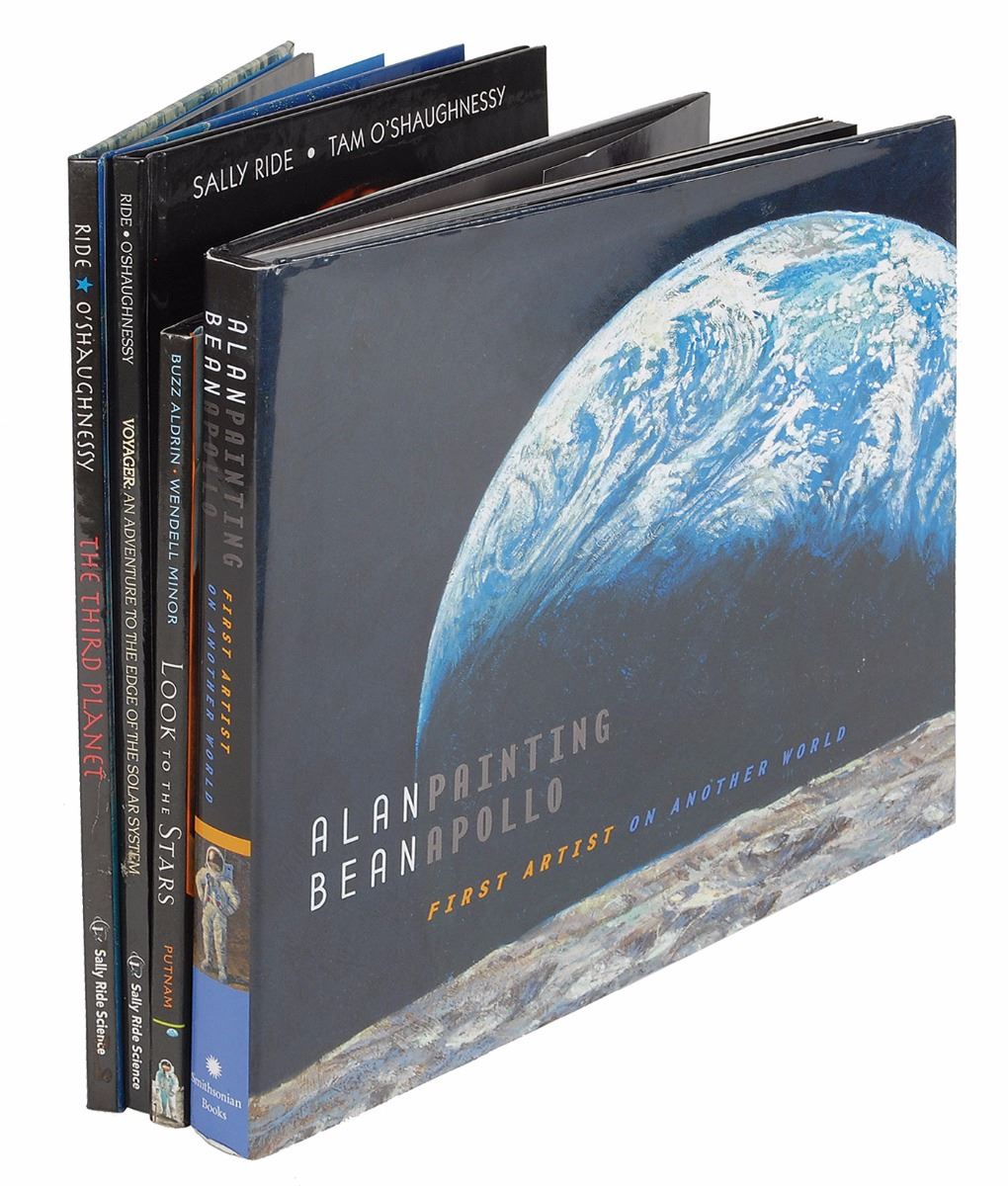 Four books: a first edition of Look to the Stars, hardcover with dust jacket, signed on the title page in blue ink by Buzz Aldrin; a first edition of Painting Apollo, hardcover with dust jacket, signed on the half-title page in gold ink by Alan Bean; a second edition of Voyager: An Adventure to the Edge of the Solar System, hardcover, signed on the page adjacent to the title page in black felt tip by Sally Ride; and a second edition of The Third Planet: Exploring the Earth from Space, hardcover, signed on the page adjacent to the title page in black felt tip by Ride. In overall fine condition.