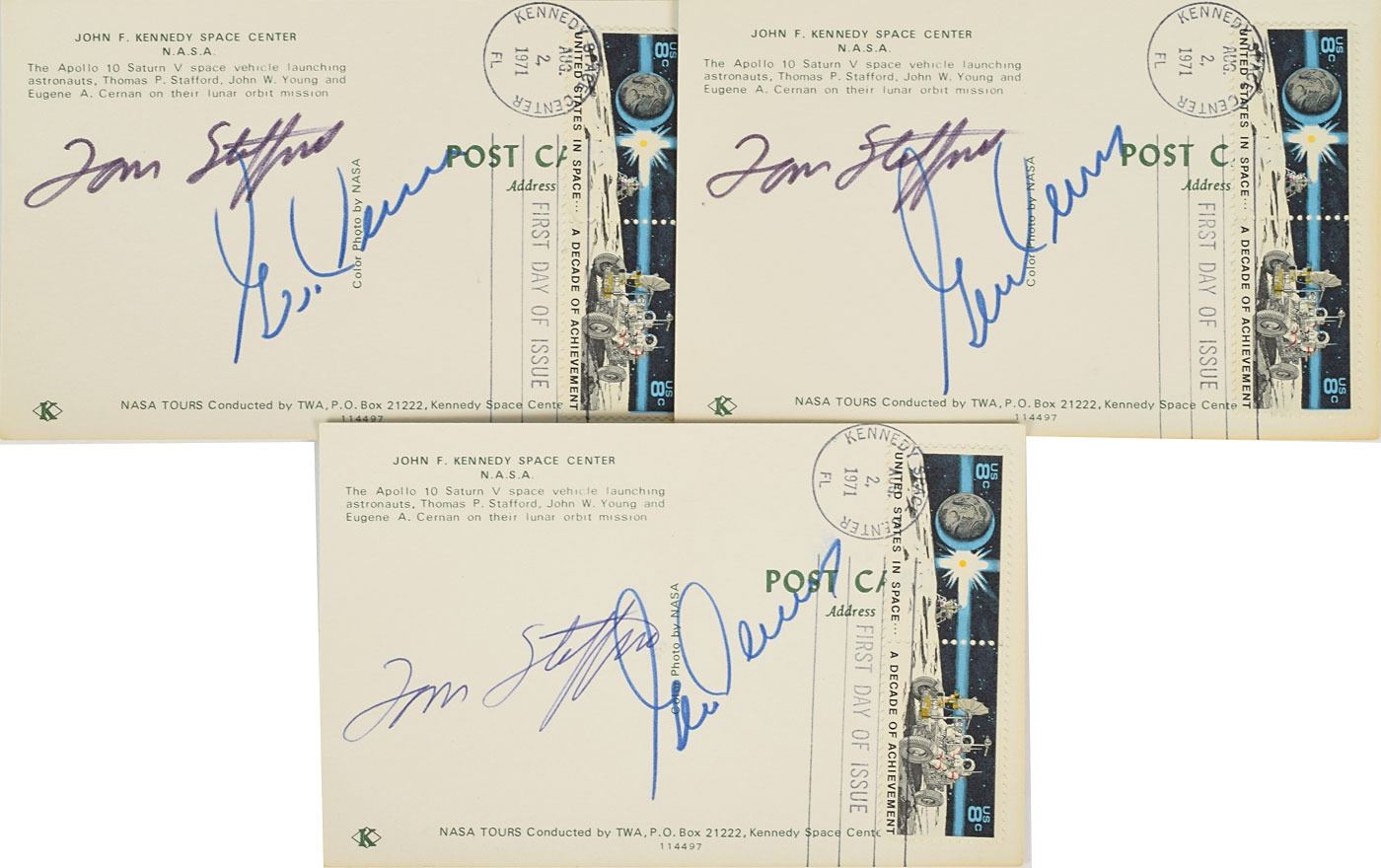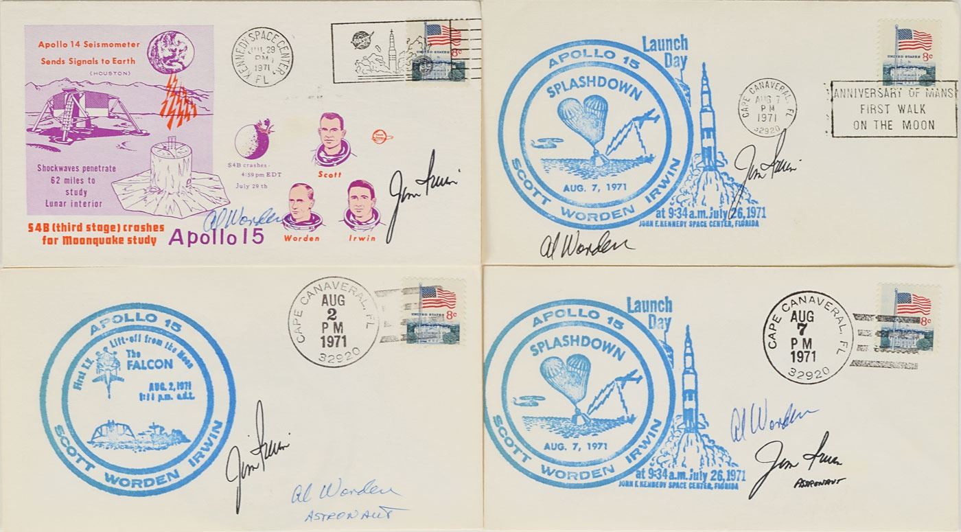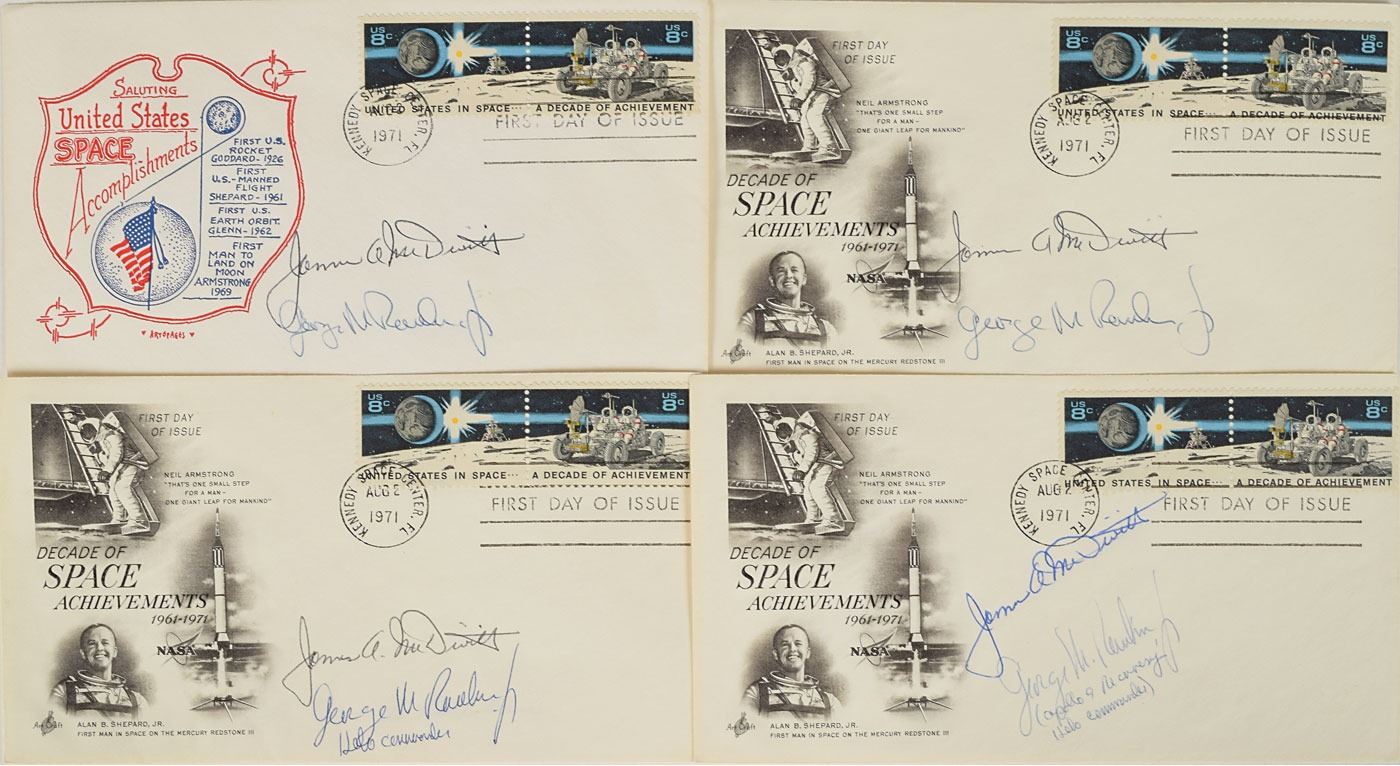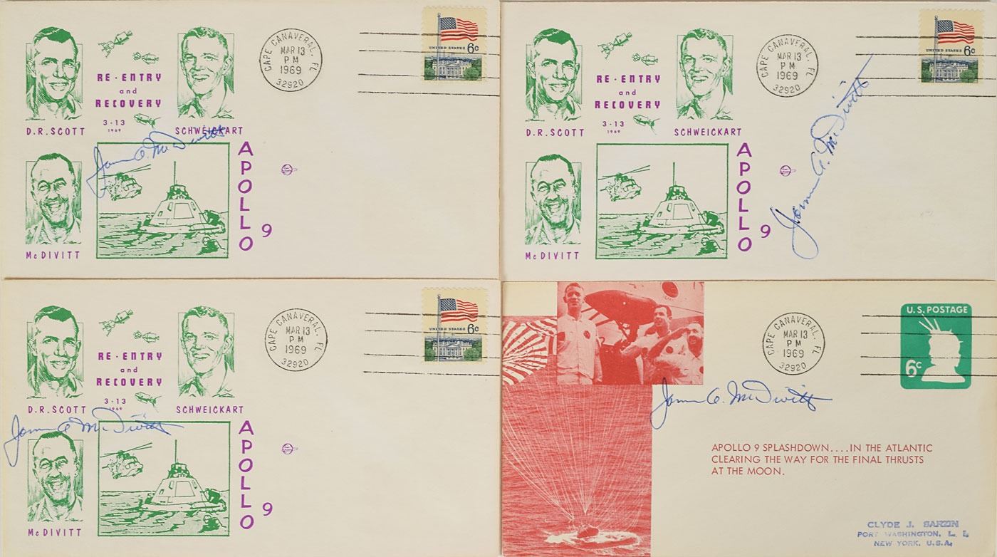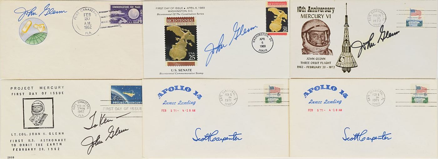 Tremendous collection of 103 postcards, FDCs, and commemorative covers, with several bearing launch dates and mission-specific cachets, ranging in size from 5.5 x 3.5 to 8.5 x 4.5, each signed in ink or felt tip by one or more NASA astronauts, including: Edgar Mitchell (27 limited edition Horizon covers for the Nobel Prize centennial); Walt Cunningham and Donn Eisele (4, with two signed by Apollo 7 recovery pilot Edward A. Skube); Donn Eisele; Jim McDivitt (14, with ten signed by various Apollo 9 and Gemini 4 recovery pilots); Rusty Schweickart (2); Gene Cernan (also signed by Jeana Yeager and James Adamson); Gene Cernan and Tom Stafford (3); Charles Conrad (3, each also signed by Gemini 5 recovery pilot Fred Highsmith); Al Worden (12); Jim Irwin (9); Jim Irwin and Al Worden (9; five of which are Royal Air Force covers); Gene Cernan (11, with one signed by C. A. Matthes, director of the Guam NASA station); John Glenn (4, one inscribed); Scott Carpenter (2); and Deke Slayton. In overall fine condition.