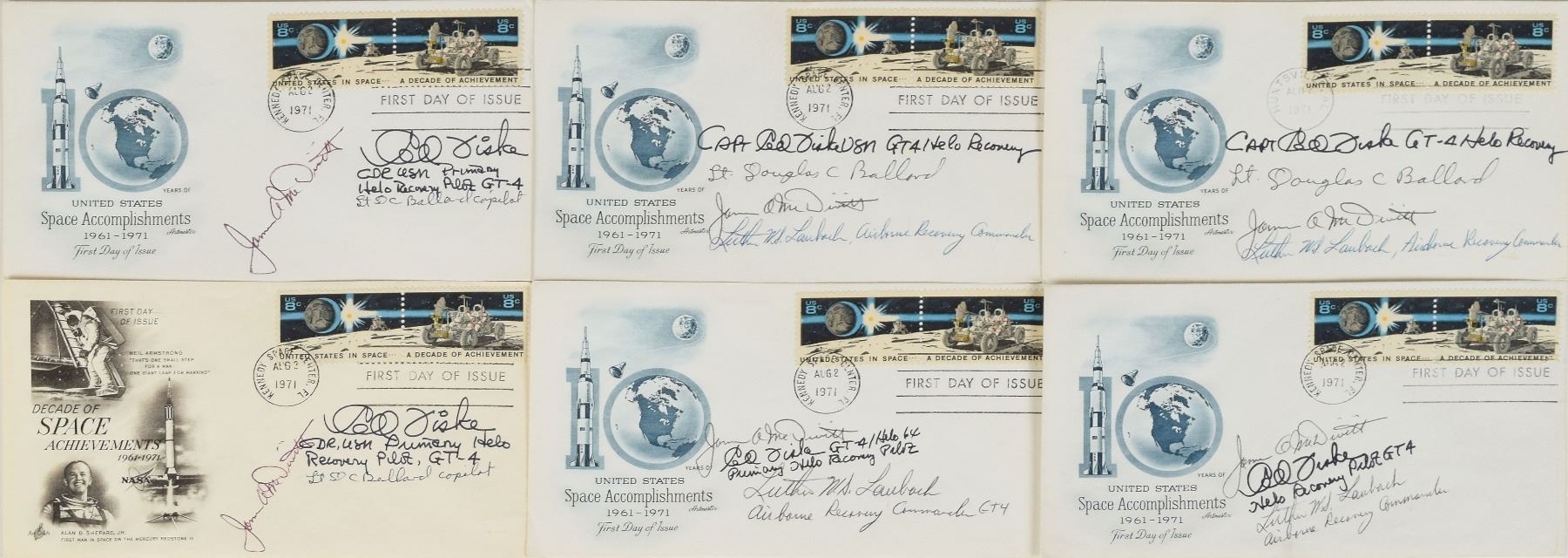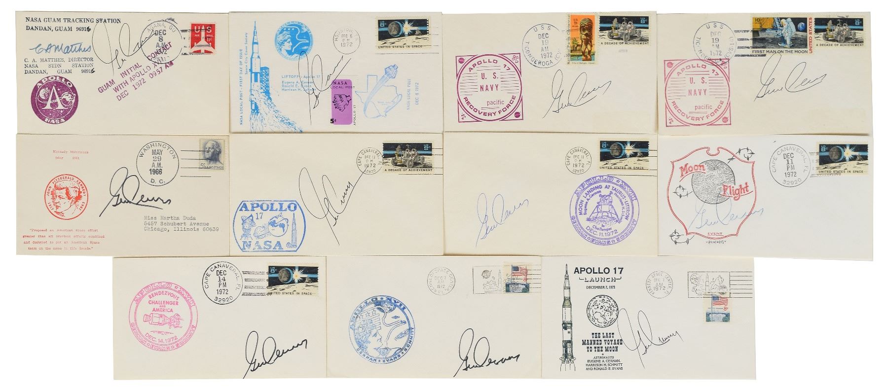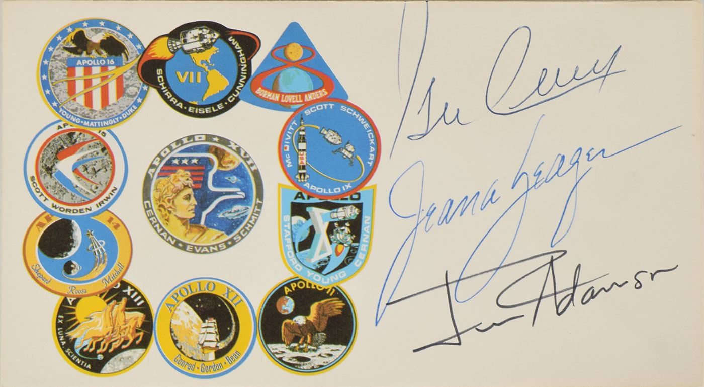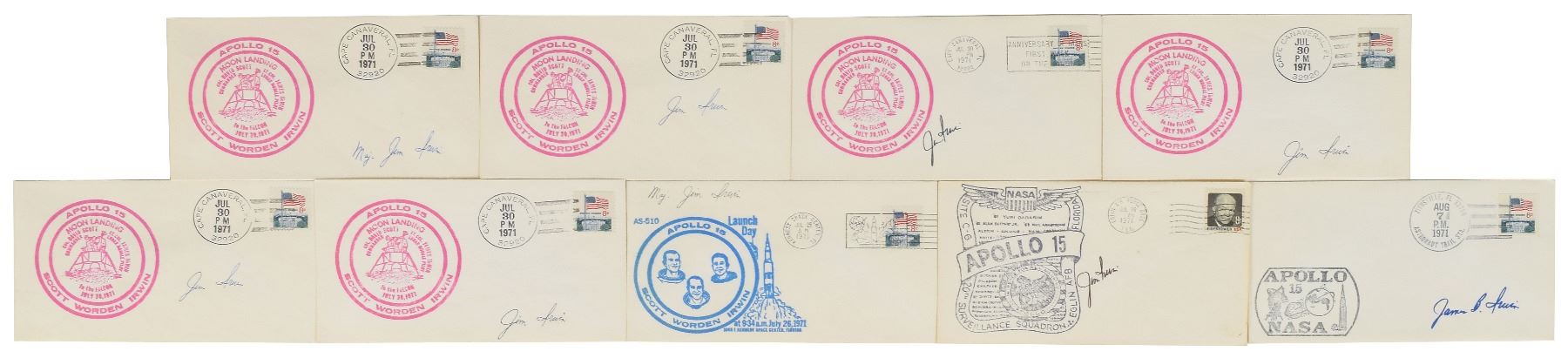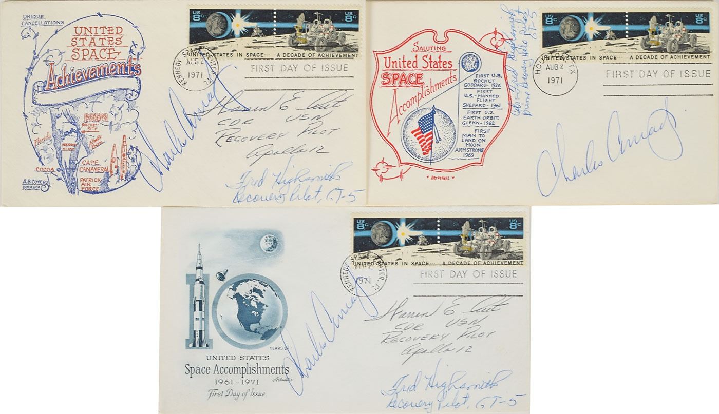 Tremendous collection of 103 postcards, FDCs, and commemorative covers, with several bearing launch dates and mission-specific cachets, ranging in size from 5.5 x 3.5 to 8.5 x 4.5, each signed in ink or felt tip by one or more NASA astronauts, including: Edgar Mitchell (27 limited edition Horizon covers for the Nobel Prize centennial); Walt Cunningham and Donn Eisele (4, with two signed by Apollo 7 recovery pilot Edward A. Skube); Donn Eisele; Jim McDivitt (14, with ten signed by various Apollo 9 and Gemini 4 recovery pilots); Rusty Schweickart (2); Gene Cernan (also signed by Jeana Yeager and James Adamson); Gene Cernan and Tom Stafford (3); Charles Conrad (3, each also signed by Gemini 5 recovery pilot Fred Highsmith); Al Worden (12); Jim Irwin (9); Jim Irwin and Al Worden (9; five of which are Royal Air Force covers); Gene Cernan (11, with one signed by C. A. Matthes, director of the Guam NASA station); John Glenn (4, one inscribed); Scott Carpenter (2); and Deke Slayton. In overall fine condition.