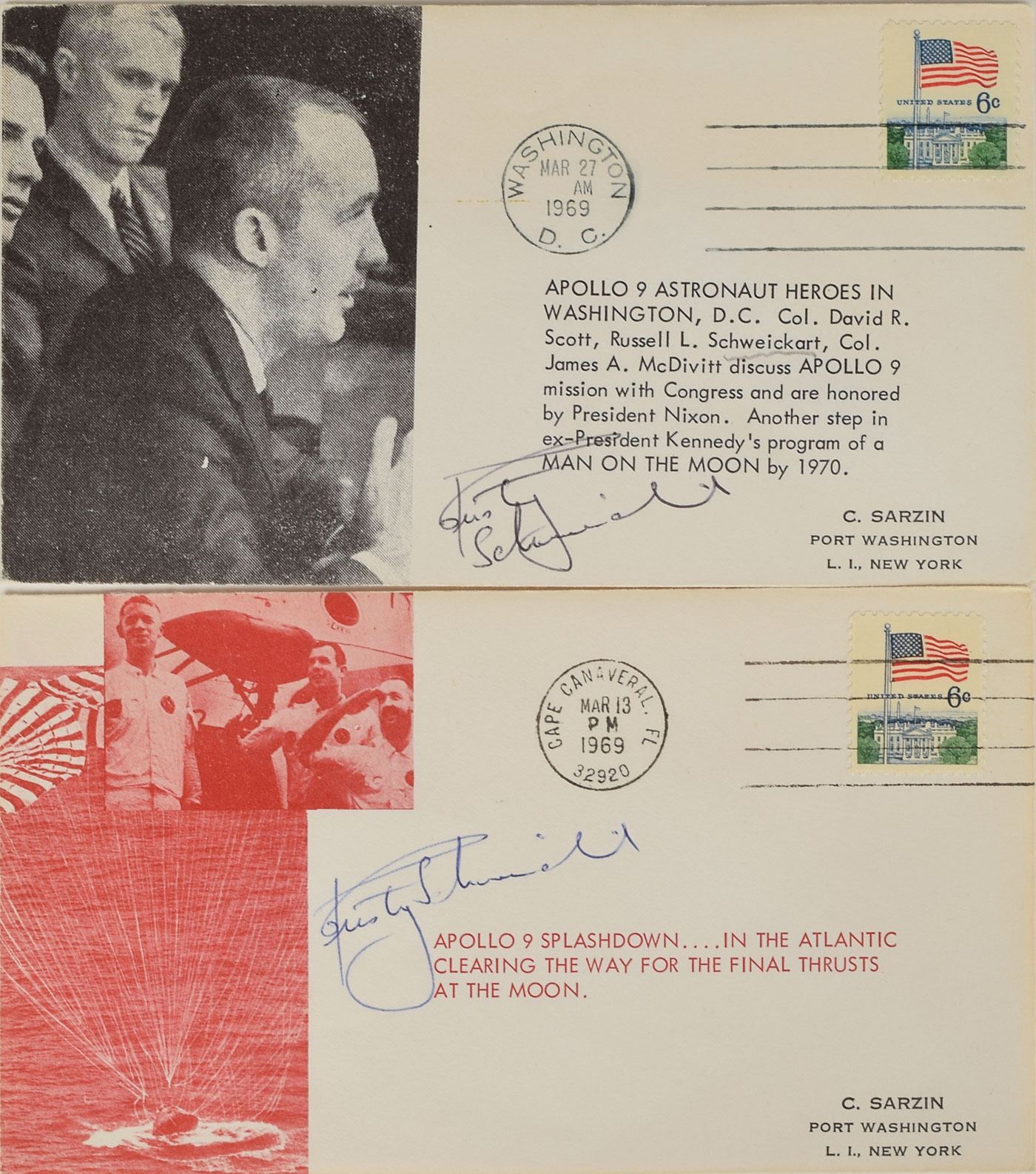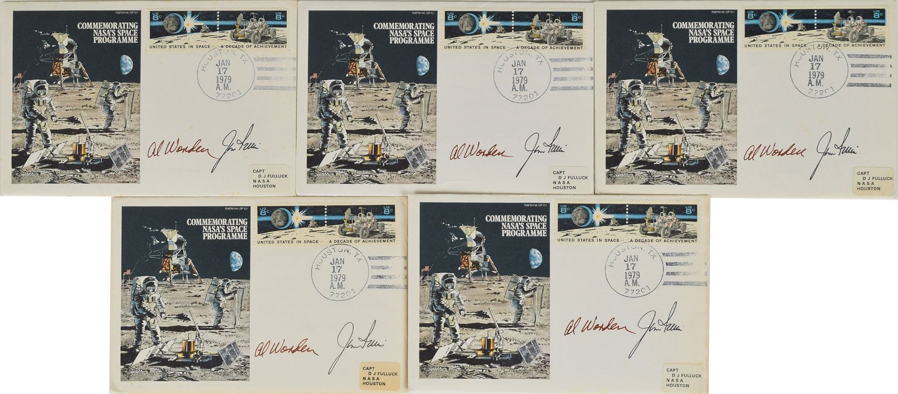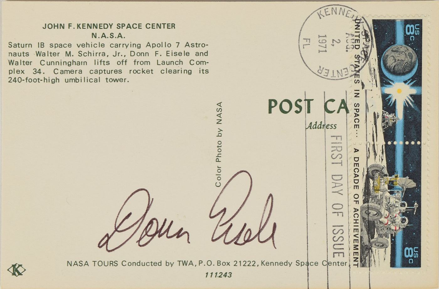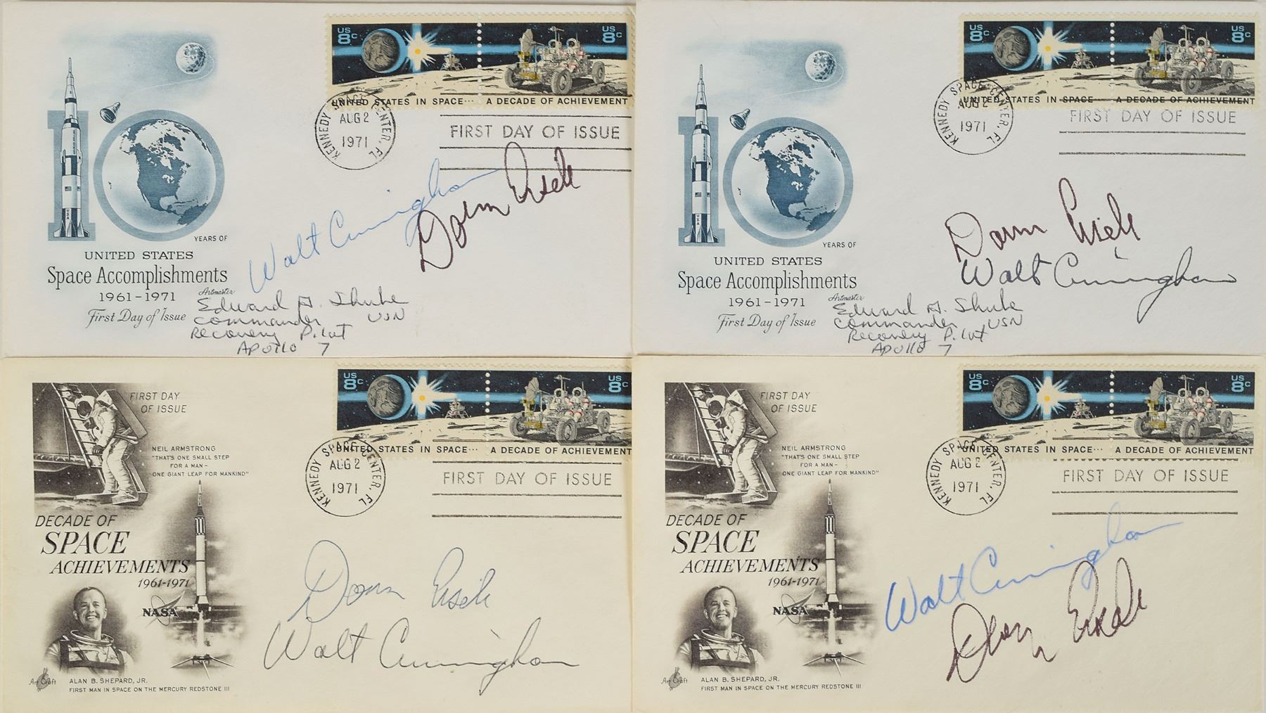 Tremendous collection of 103 postcards, FDCs, and commemorative covers, with several bearing launch dates and mission-specific cachets, ranging in size from 5.5 x 3.5 to 8.5 x 4.5, each signed in ink or felt tip by one or more NASA astronauts, including: Edgar Mitchell (27 limited edition Horizon covers for the Nobel Prize centennial); Walt Cunningham and Donn Eisele (4, with two signed by Apollo 7 recovery pilot Edward A. Skube); Donn Eisele; Jim McDivitt (14, with ten signed by various Apollo 9 and Gemini 4 recovery pilots); Rusty Schweickart (2); Gene Cernan (also signed by Jeana Yeager and James Adamson); Gene Cernan and Tom Stafford (3); Charles Conrad (3, each also signed by Gemini 5 recovery pilot Fred Highsmith); Al Worden (12); Jim Irwin (9); Jim Irwin and Al Worden (9; five of which are Royal Air Force covers); Gene Cernan (11, with one signed by C. A. Matthes, director of the Guam NASA station); John Glenn (4, one inscribed); Scott Carpenter (2); and Deke Slayton. In overall fine condition.