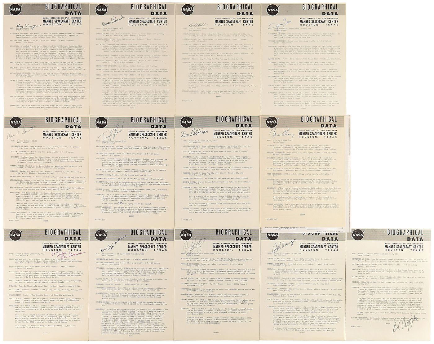 Collection of 13 official NASA biographical data sheets, each signed in ink by the associated astronaut, including: Ron Evans, Bruce McCandless, Owen K. Garriott, Tony England, Bill Pogue, Don Peterson, Brian O'Leary, Bob Overmeyer, Story Musgrave, Vance Brand (who adds a line in his own hand: "Was backup commander of Skylab II & III. Am CMP on Apollo/Soyuz mission), Karol J. Bobko, Jerry Carr, and Bob Crippen. In overall fine condition.
