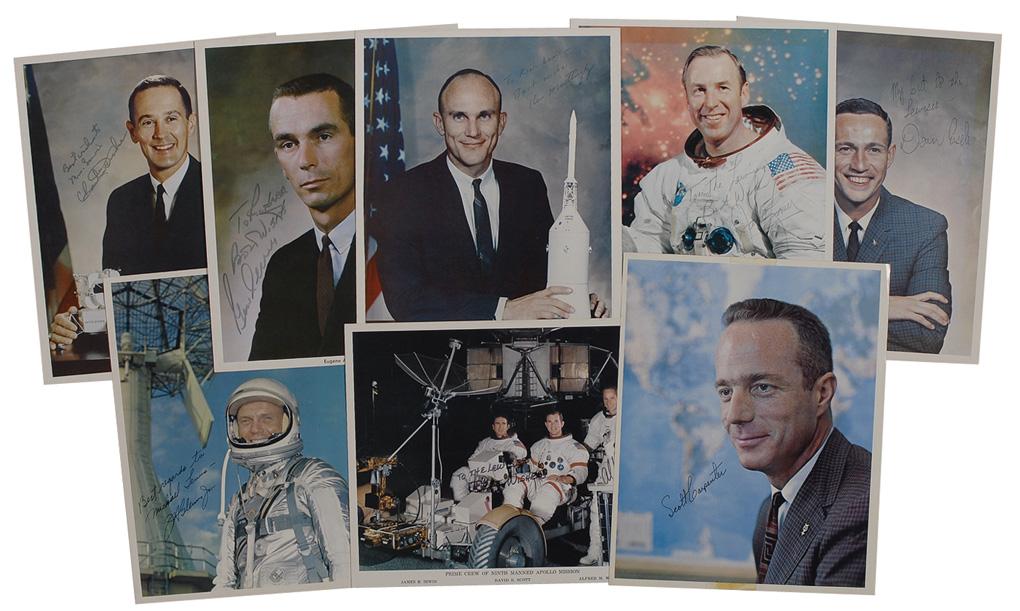 Eight color NASA photos, seven 8 x 10 and one 10 x 8, each signed and inscribed in ink or felt tip by the respective astronaut pictured. Signers are: Charlie Duke, Gene Cernan, Donn Eisele, John Glenn, James Lovell, Ken Mattingly, Al Worden, and Scott Carpenter. Tape to edges of Carpenter’s photo, Lovell’s signature light, but legible, otherwise fine overall condition.