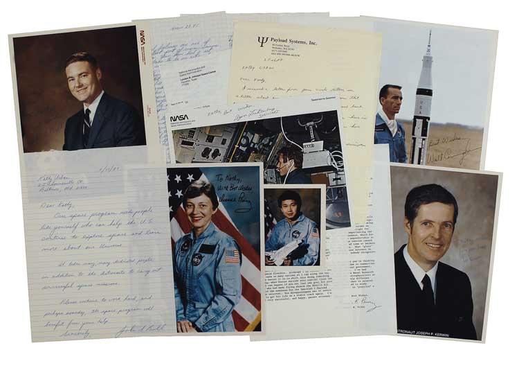 Twelve items, consisting of signed photos, ALSs, and TLSs, from a total of eight different astronauts. All have written to a sick young girl recovering from surgery, at the behest of her uncle, as she has aspirations of becoming an astronaut. Participating astronauts are Walt Cunningham (photo), Eugene Trinh (photo), Byron Lichtenberg (photo and letter), Joe Kerwin (photo and letter), Dianne K. Prinz (photo and letter), John S. Bull (photo and letter), Pete Knight (letter), and Gary Payton (letter). Almost all of the photos are inscribed to Kathy. Payton writes, in part: “Like everything in life though, the good things are accompanied by some bad things. One of the guys I flew with, El Onizuka, was on board the Challenger. Since that awful day, I have attended many memorial ceremonies, seen many missing-man formations, heard many sad speeches, and shed many tears. But I have learned a considerable amount about the American people since then. I’ve learned that Americans have a trait called resiliency.” Further excerpts and images of all the letters are available on line at rrauction.com. In fine overall condition. Pre-certified Scott Cornish and RRAuction COA.