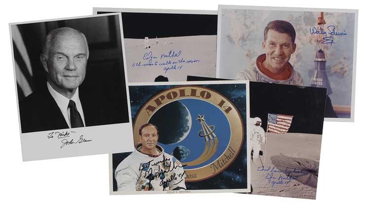Five signed glossy and satin-finish photos, one 8 x 10 and four 10 x 8, including four color, each signed in felt tip by the respective astronaut pictured. Signers are: John Glenn (ins), Edgar Mitchell (3), and Wally Schirra. In fine condition. Pre-certified Scott Cornish and RRAuction COA.