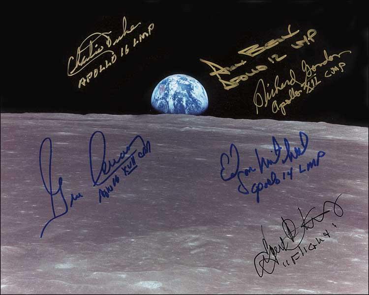 Color satin-finish 10 x 8 photo of the earth as seen from the lunar surface, signed in blue felt tip by Edgar Mitchell and Gene Cernan and in gold ink by Charlie Duke, Alan Bean, and Richard Gordon, with all five astronauts adding their respective missions below their signatures. Also signed by former NASA Flight Director Eugene Kranz in black ink, adding “Flight.” In fine condition, with collector’s label to reverse. Pre-certified Scott Cornish and RRAuction COA.