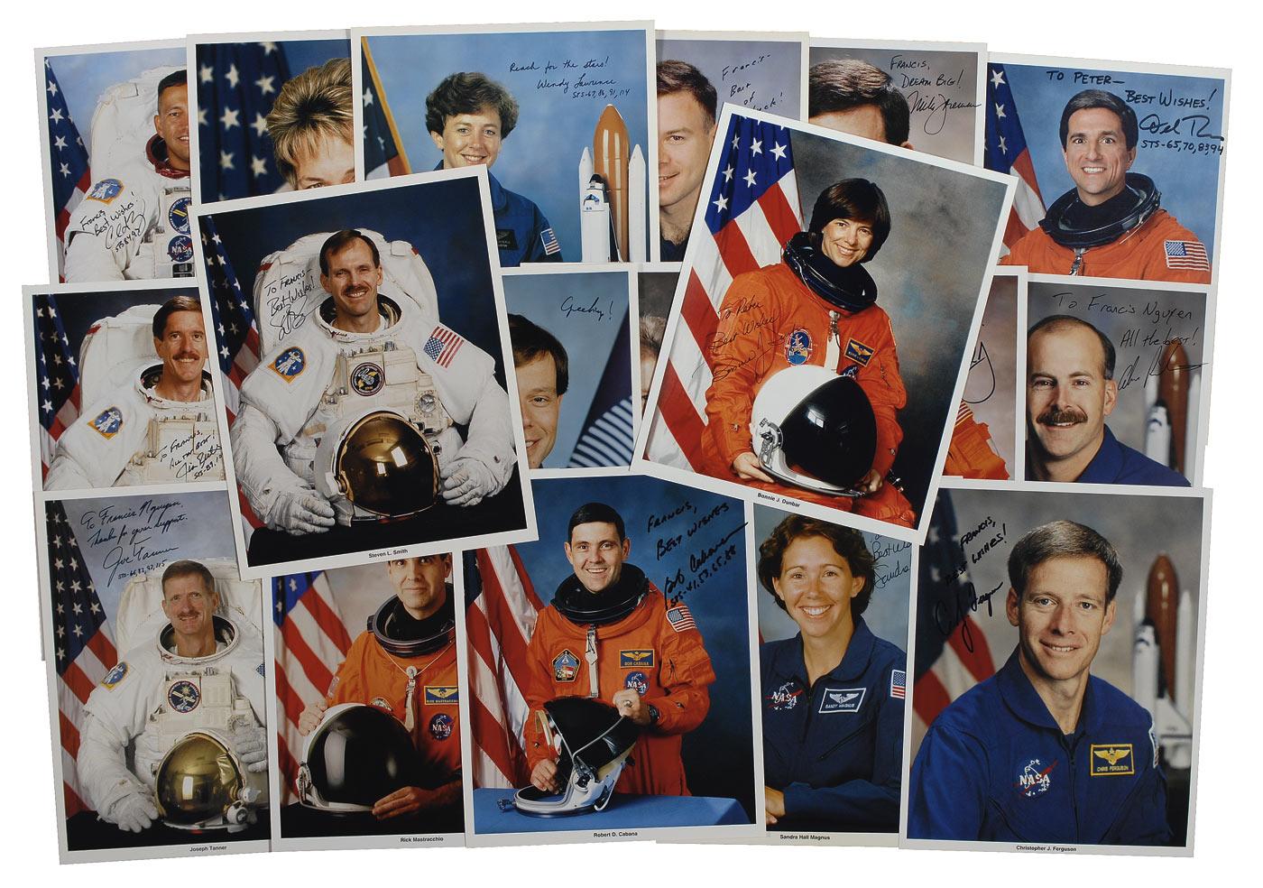 Nineteen signed color NASA 8 x 10 photos, each signed in ink or felt tip by the respective astronaut pictured, with many adding short inscriptions. Signers are: Donald Thomas, Mike Foreman, Carlos Noriega, Jim Kelly, Wendy Lawrence, Peggy Whitson, Mark Polansky, Alan Poindexter, Brent Jett, Christer Fuglesang, Leroy Chiao, Jim Reilly, Joseph Tanner, Rick Mastracchio, Bob Cabana, Sandra Magnus, C. J. Ferguson, Steve Smith, and Bonnie Dunbar. In fine condition. Pre-certified Scott Cornish and RRAuction COA.