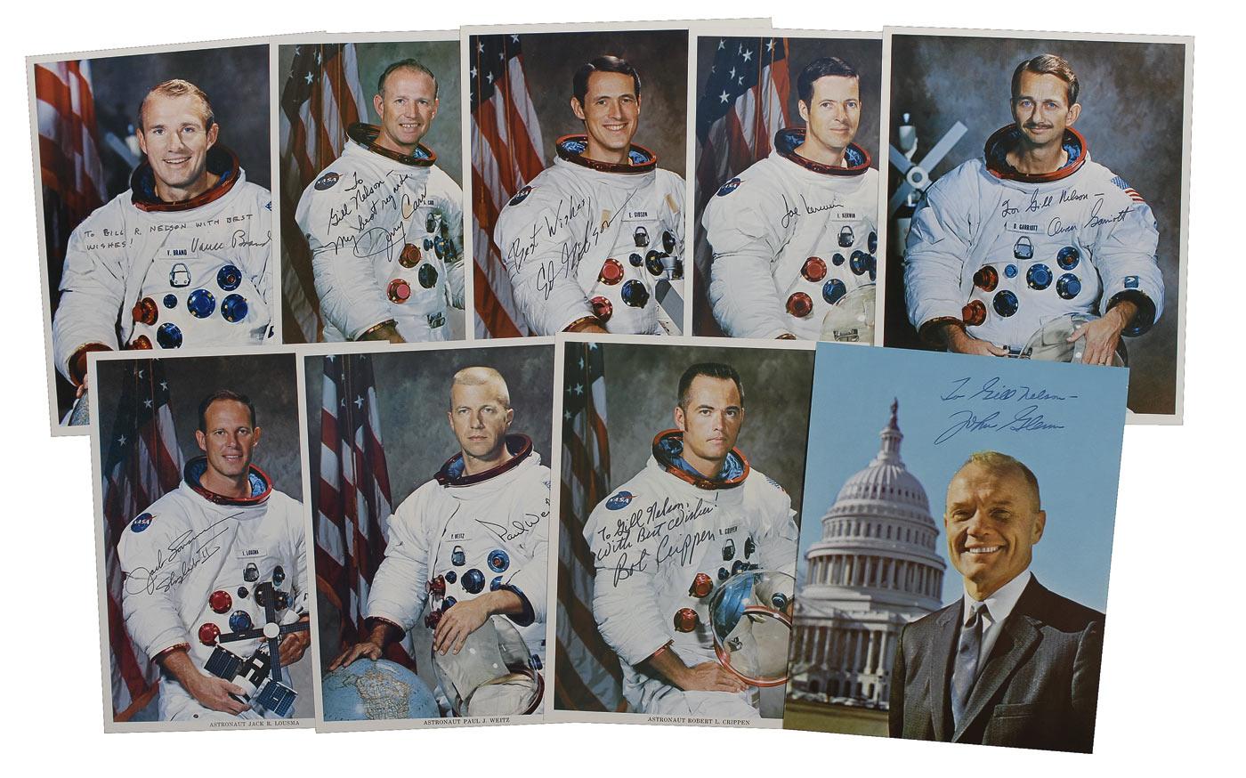 Nine signed color 8 x 10 photos, including eight NASA photos, each signed in ink or felt tip by the respective astronaut pictured. Signers are: Vance Brand (ins), Jerry Carr (ins), Ed Gibson, Owen Garriott (ins), Joe Kerwin, Jack Lousma, Paul Weitz, Bob Crippen (ins), and John Glenn (ins). In fine overall condition. Pre-certified Scott Cornish and RRAuction COA.