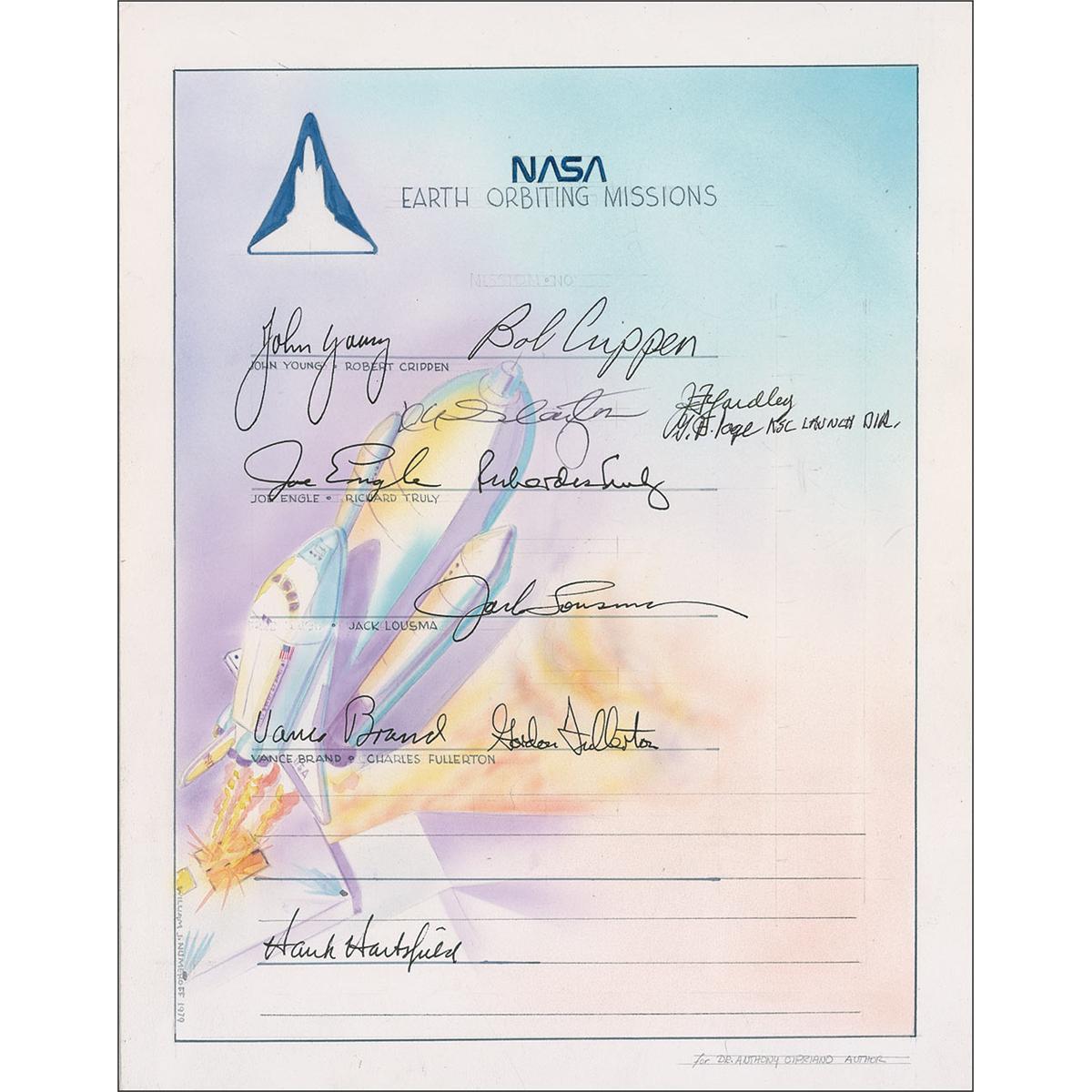 Original watercolor and ink artwork by space artist William J. Numeroff, 9.5 x 12, titled “NASA, Earth Orbiting Missions,” and featuring an image of a space shuttle lifting off. Signed in ink and felt tip by astronauts John Young, Bob Crippen, D. K. Slayton, Joe Engle, Richard Truly, Jack Lousma, Vance Brand, Gordon Fullerton, and Hank Hartsfield. Also signed “J.F. Yardley” and “G.F. Page KSC Launch Dir.” Also signed vertically in ink, “William J. Numeroff 1979.” Also inscribed at the lower edge by Numeroff: “for Dr. Anthony Cipriano Author” and inscribed and signed in ink on the reverse, "For Tony - With Love & Affection, William Joffe Numeroff 1979." In very fine condition.