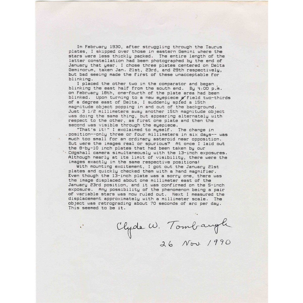 Exciting account by Clyde Tombaugh of the hours leading up to his discovery of Pluto. Typed 8.5'' x 11'' document signed ''Clyde W. Tombaugh / 26 Nov. 1990'' reads in part, ''In February 1930, after struggling through...Taurus...I skipped [to] eastern Gemini where the stars were less thickly packed...I suddenly spied an...object...'That's it!' I exclaimed to myself...Any possibility of the phenomenon being a pair of variable stars was now ruled out...This seemed to be it.'' Tombaugh crosses out an errant ''a'' in description. Near fine condition.