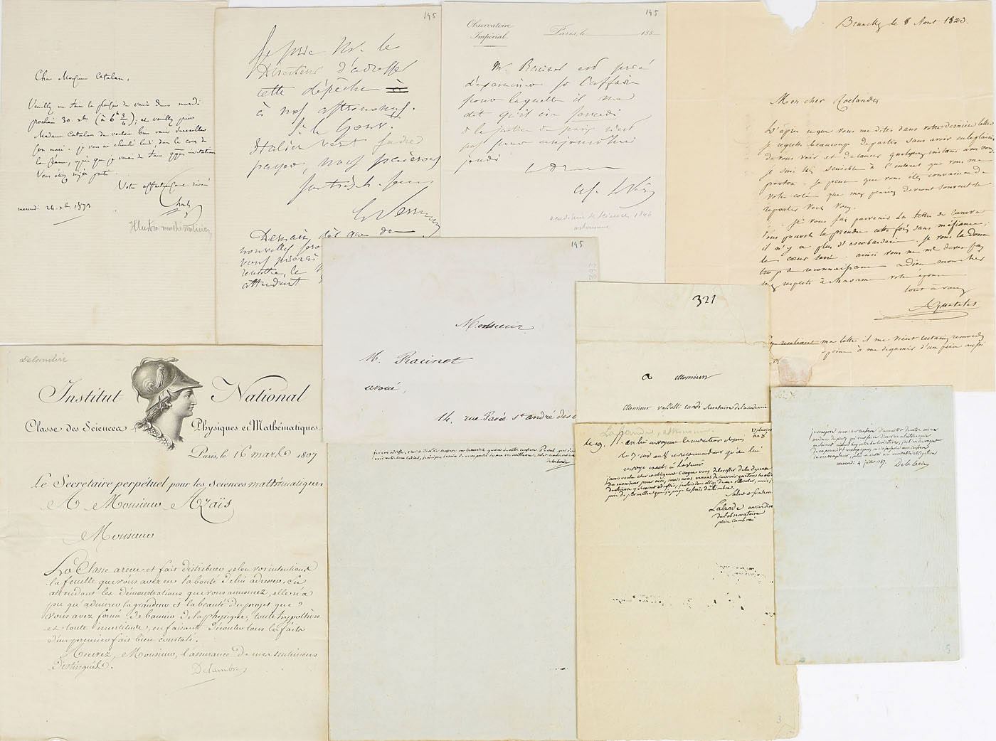Group of nine autographs of astronomers and mathematicians, primarily comprised of letters, dated from 1787–1873, including: M. Chasles, J. B. J. Delambre, J. J. Le Français de Lalande (4), U. J. J. Leverrier (2), and A. Quetelet. In overall fine condition.