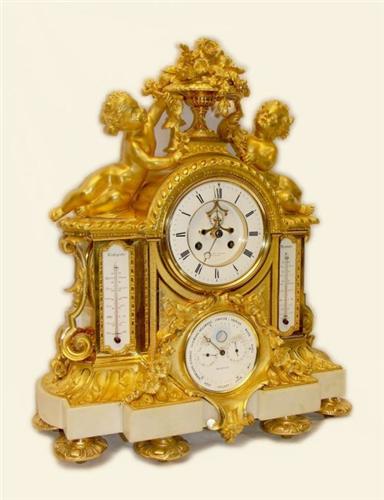 Très rare et importante pendule de cheminée astronomique, phases de lune, triple quantième perpétuel, bronze doré, échappement Brocot visible, 15 jours de réserve de marche, sonnerie des heures et des demies, baromètre et thermomètre, cadran en émail blanc à chiffres romains, aiguilles Breguet en acier bleui, époque 1860