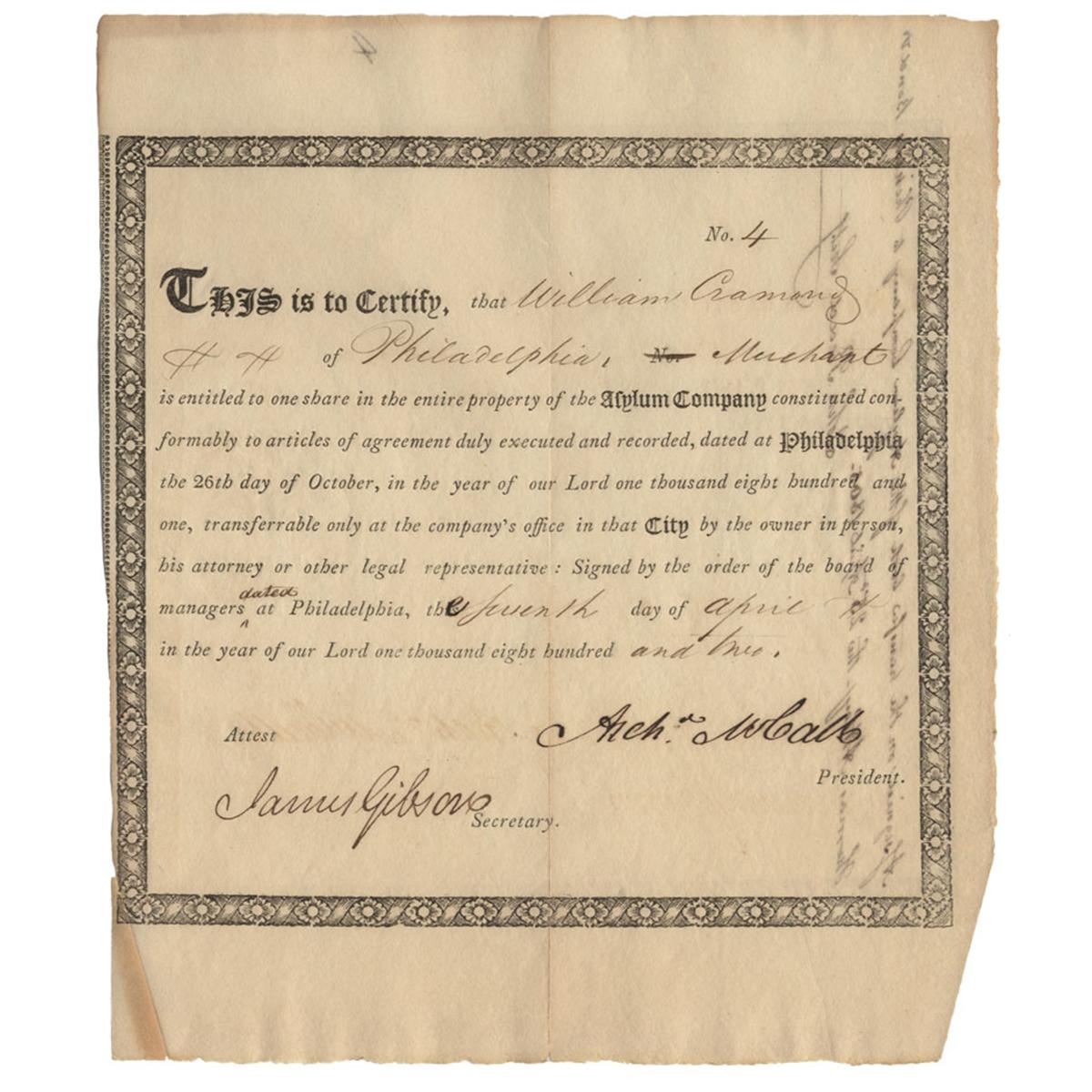 1802, Philadelphia One share issued to William Cramond. Signed as secretary of the company by James Gibson and by Archibald McCall as president. This company was an attempt to reorganize the earlier asylum company founded by Robert Morris and John Nicholson. The original Asylum Company was formed in 1792 to provide refuge for King Louis XVI and Marie Antoinette and other elite members of the overthrown French government which never materialized. A scarce early stock from this extremely interesting company. 7" x 8" Trimmed close at left border. There is a 3” archival tape repair along vertical center fold split. Uncancelled. Extremely fine.
