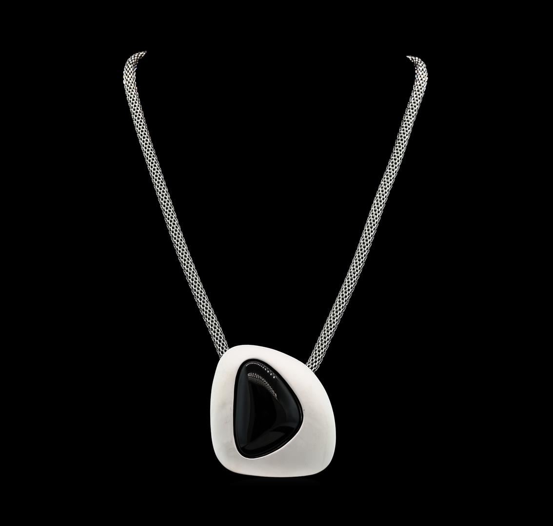 High end designer jewelry. Asymmetry Stone Pendant Short Necklace - Rhodium. Rhodium/ Black2 Inches Ext.. Silver/ Black. 16inches.
