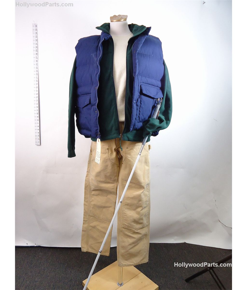 Hero outfit worn by Val Kilmer as Virgil Adamson in At First Sight. Costume consists of navy sleeveless Cabela's quilted down vest size large, Patagonia green fleece zipper front jacket, pair of Carheartt painters pants and walking stick. Scenes 9-11.