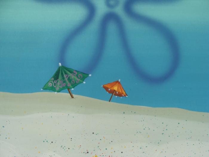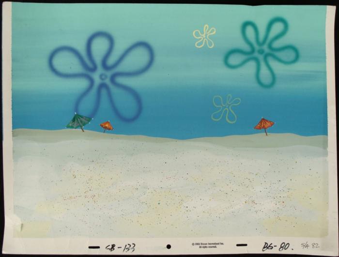 This original hand-painted background from the Nickelodeon TV show SpongeBob Squarepants. The story takes place under the deep blue sea in Bikini Bottom, where SpongeBob resides. SpongeBob, who is a yellow, porous sponge, is your typical happy-go-lucky character, as he is always cheerful and enjoys making people laugh. Patrick Star, SpongeBob's neighbor who is a starfish, is your average children's show idiot, as he boasts knowing nothing and is often getting himself into ridiculous situations. Between the homes of these two lies the home of the miserable Squidward, a squid, who is known for being grouchy and playing tricks on SpongeBob and Patrick. Both SpongeBob and Squidward work at the Krusty Krab, a fast food business run by the greedy money-loving Mr. Krabs, a crab, the arch rival of the evil, possibly misunderstood, Plankton. Another neighbor, Sandy Cheeks, an athletic squirrel who normally wears an astronaut's space suit, was introduced in "Tea at the Treedome." She spends most of her time inventing and experimenting. At The Beach.Original Production Background Overall Size of Background: 13 1/2" x 17 1/2" Very good conditionOriginal Production Backgrounds are used in the making of the final version of animated productions. The background establishes the location and the overall good mood of the scenee. Typically, a background layout artist creates a drawing to establish the content of the scene, placement of characters, perspective and camera angle. Based on this drawing, the background artist creates a preliminary painting to confirm all of the scenes details, then the final production background which is used in the filming of the scene. When these backgrounds are individually photographed behind the progression of production cels, and projected at a rapid succession, the images in the foreground appear to move, creating an animated scene. The background is ready to be matted and framed. It is a colored background with the animator's notations at the bottom.