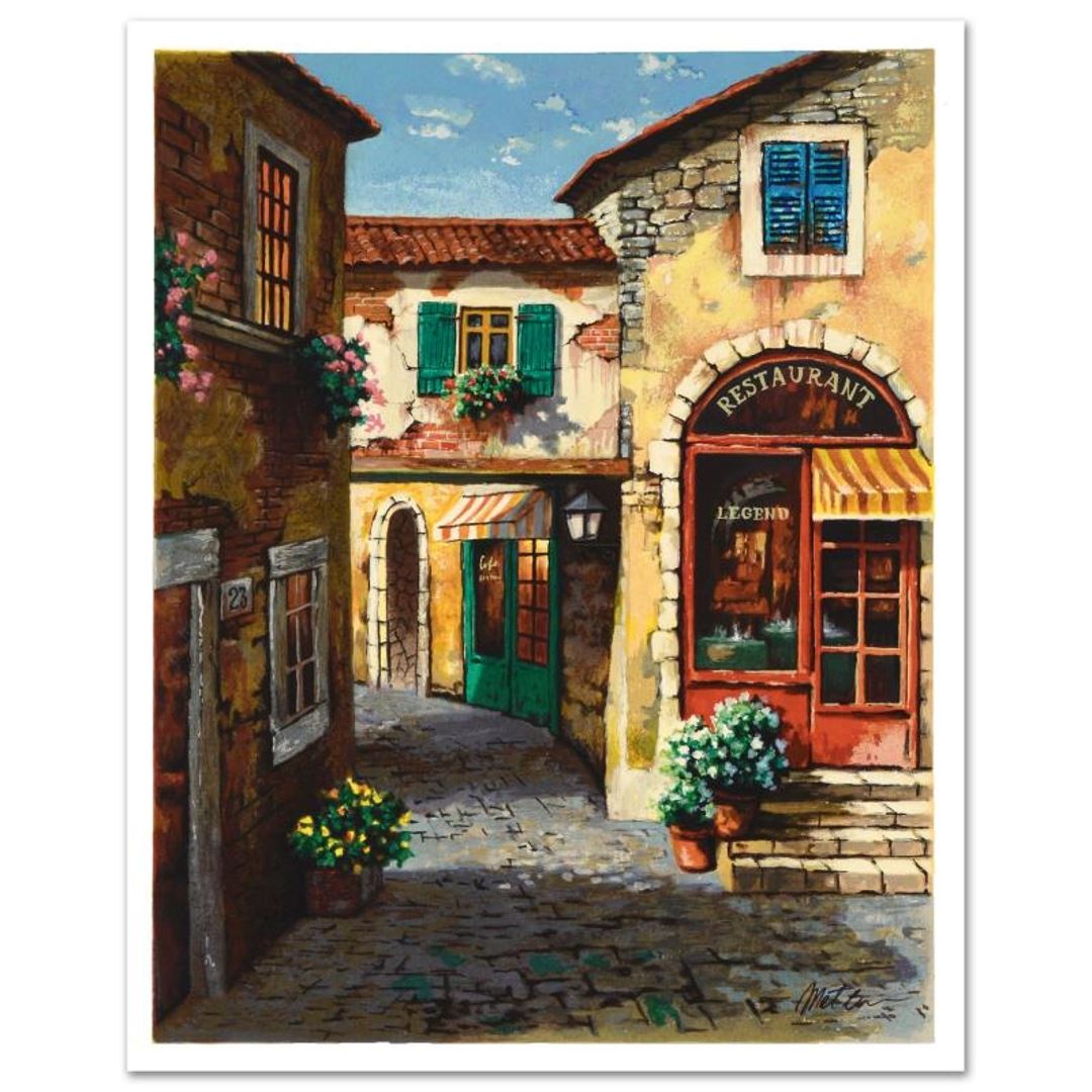 "At the Alley" is a limited edition lithograph on paper by Anatoly Metlan, numbered and hand signed by the artist! Includes Certificate of Authenticity! Measures approx. 14.5" x 18.5" (with border), 12" x 15.5" (image).