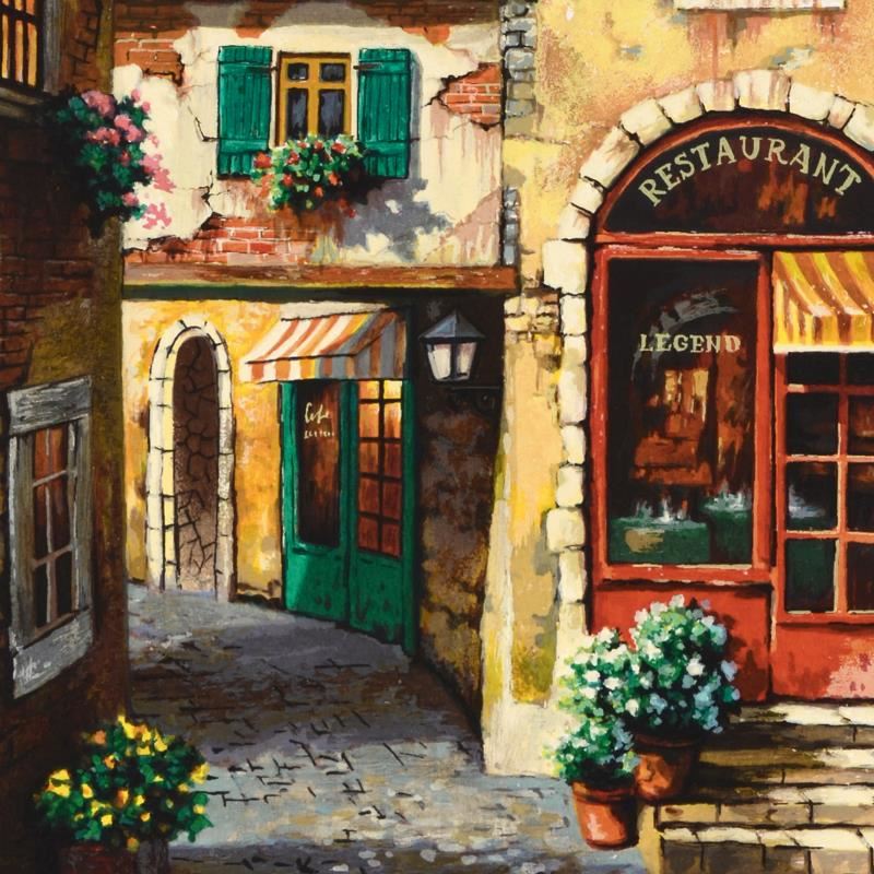 "At the Alley" is a limited edition lithograph on paper by Anatoly Metlan, numbered and hand signed by the artist! Includes Certificate of Authenticity! Measures approx. 14.5" x 18.5" (with border), 12" x 15.5" (image).