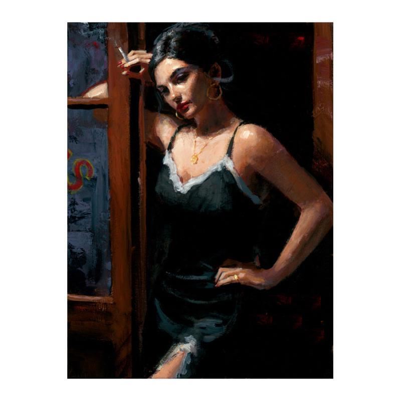 "At the Door III" is a hand embellished limited edition giclee on stretched canvas by Fabian Perez. The piece is numbered and hand signed by the artist and comes with a Certificate of Authenticity. Measures approx. 40" x 30" (image). Please allow 5 additional business for items that include canvas stretch or framing.