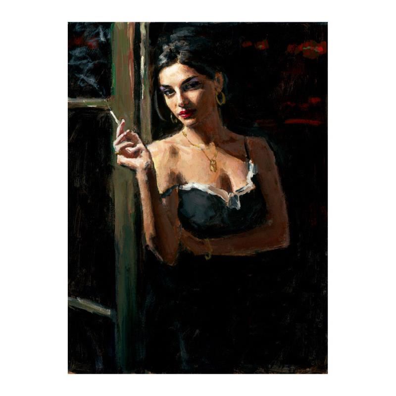 "At the Door V" is a hand embellished limited edition giclee on stretched canvas by Fabian Perez. The piece is numbered and hand signed by the artist and comes with a Certificate of Authenticity. Measures approx. 40" x 30" (image). Please allow 5 additional business for items that include canvas stretch or framing.