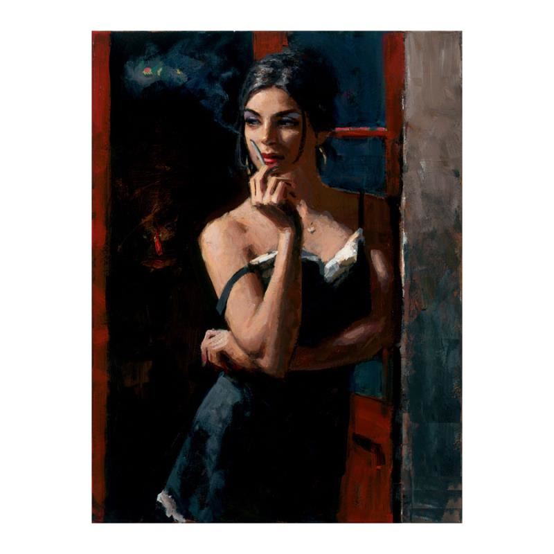 "At the Door" is a hand embellished limited edition giclee on stretched canvas by Fabian Perez. The piece is numbered and hand signed by the artist and comes with a Certificate of Authenticity. Measures approx. 40" x 30" (image). Please allow 5 additional business for items that include canvas stretch or framing.