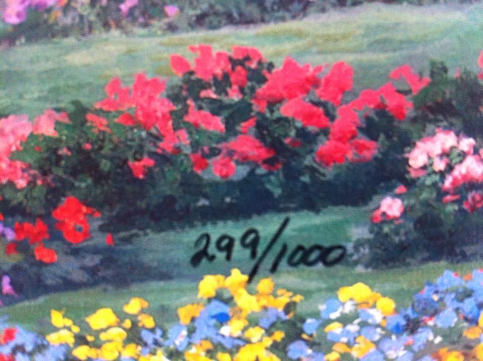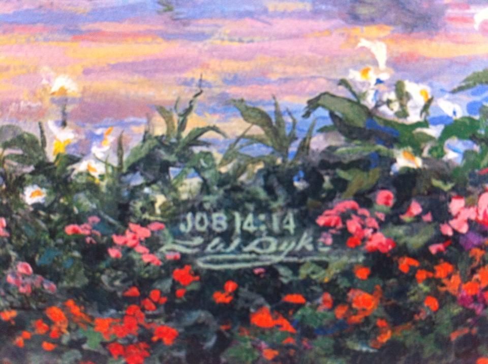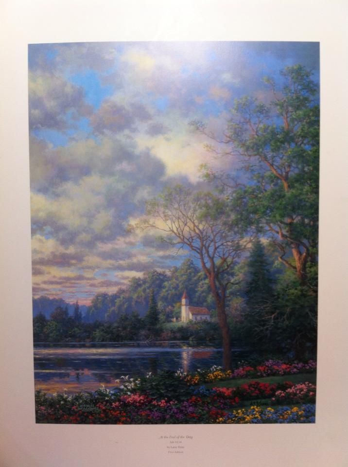"At the End of the Day" Job 14:14 by Larry Dyke First Edition print 16" x 20 1/2". Signed and numbered 299/1000 Larry Dyke has devoted his life's work to the interpretation of the beauty he beholds in nature. His success as one of America's most loved artists is proof of his distinctive ability to create a scenethat captivates the imagination of the viewer. Dyke's genius lies in his construction of intricate and subject matter are fueled by frequent travels to the most scenic vistas in America, often accompanied by his wife and daughter. In the fall, he travels from his home near Houston to hardwood country...Vermont, upstate New York or Tennessee. Over the summer, he may head west to California or Colorado. Some of his scenes appear almost photographic due to his exquisite attention to detail while other works are rendered in soft, moody pastels. Dyke begins a piece with a composed sketch on a prepared hardboard surface; it is then refined until it takes his unique perspective. His deep personal belief in Christianity is the driving force that guides Larry Dyke's life and work. In his paintings, Dyke captures not only the physical beauty of the great outdoors but also the spiritual sense of perfection he views as the handiwork of God's creation. Every painting he creates carries a related Bible verse below his signature. "When I became a full-time artist, I was impressed to put a scriptural notation on each of my paintings," Dyke states. "It is an expression of what I think the true answer to life is." A Native Texan, Dyke began painting professionally in 1976. His first Lithographs were released two years later and today he has produced more than 100 limited editions and a number of open edition prints. Many of these images were sold out shortly after release and all of Dyke's limited editions are now actively sought after by collectors. In recent years, Dyke has combined his love of golf with his artistic talents to create the most collected sports art in the country. Since the sale of his first painting, Dyke's career has been an unqualified success. Dyke's art has hung in the White House and in the homes of such distinguished personalities as Steve Allen, Shirley Jones, Vincent Price and Billy Graham. His work has also hung in the Vatican. At the personal request of Pope John Paul II, Larry Dyke Painted "Sharing the Faith", a tribute to the long and important role of the Church in America. Yet even with all the accolades for his original art as well as the immense demand for his limited edition prints, Larry Dyke continues to reach inside to strive for the excellence he sees in the natural world around him. "I believe my life and career have been guided by a commitment to my faith," Dyke says. "It has instilled in me a determination to develop my talent to the fullest."