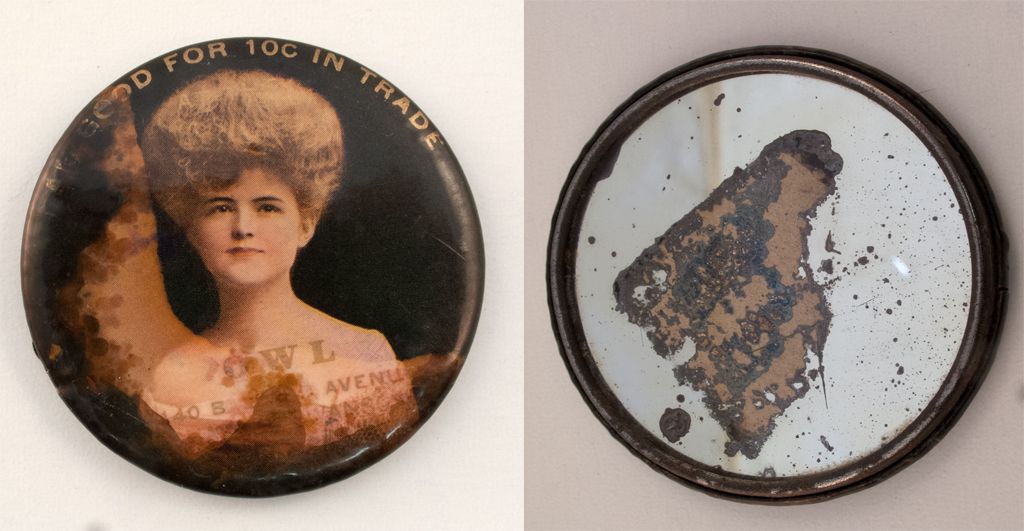 Travel Mirror- I AM GOOD FOR 10c IN TRADE AT THE OWL 5140 BALLARD AVE. -some staining , but still a real gem! 2.25" (see 1911 Seattle Polks)