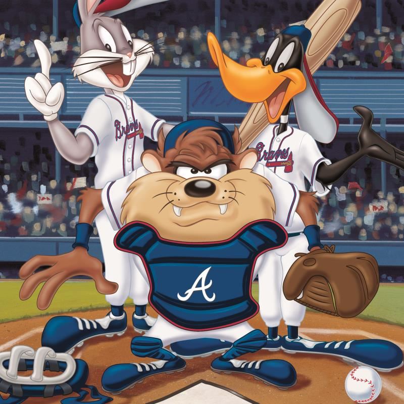 "At the Plate (Braves)" is a limited edition giclee on paper from Warner Bros. featuring iconic Looney Tunes characters in Atlanta Braves MLB uniforms. It comes numbered, with hologram seal, and a Certificate of Authenticity! Measures approx. 16 x 20" (with border), 12" x 16" (image).