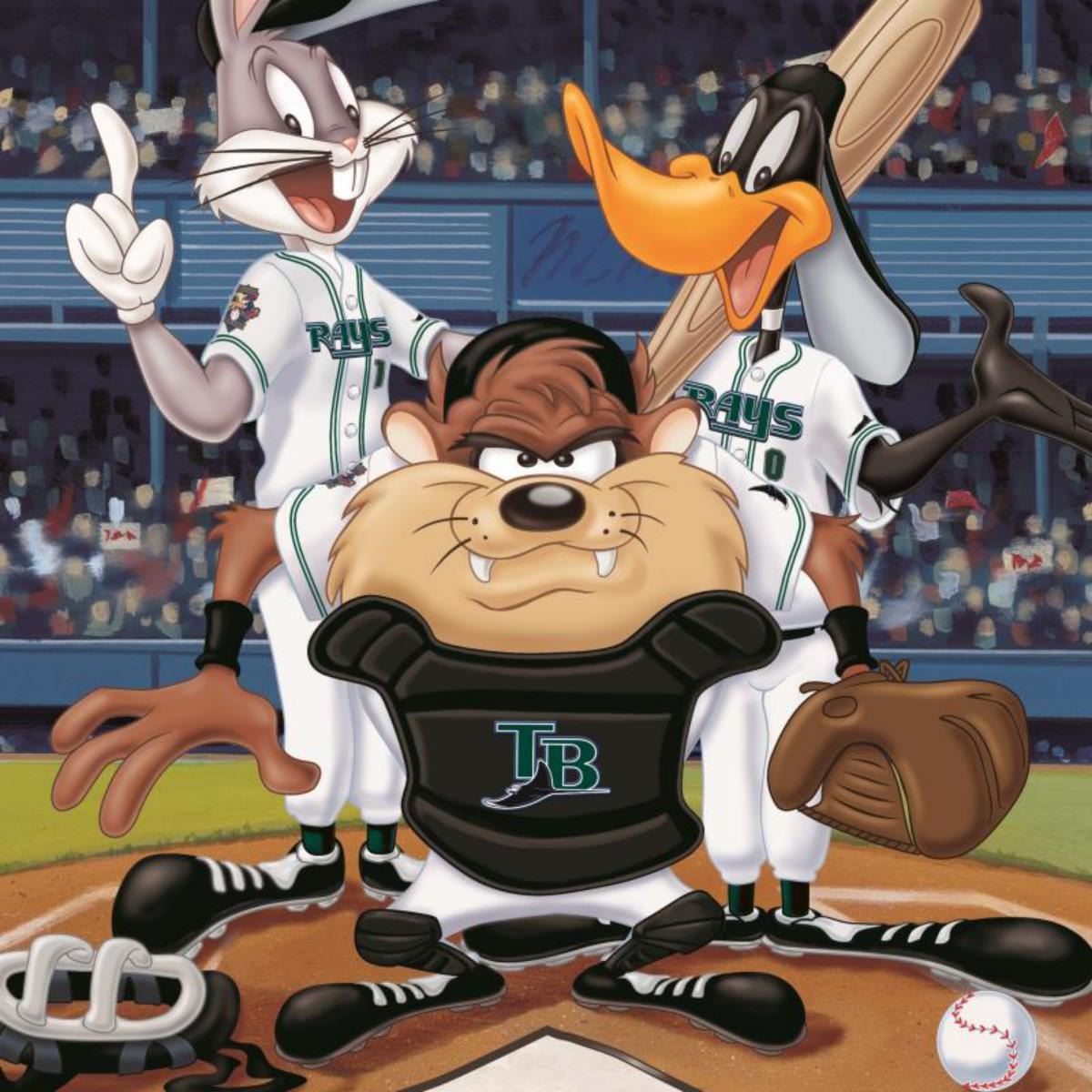 "At the Plate (Devil Rays)" is a limited edition giclee on paper from Warner Bros. featuring iconic Looney Tunes characters in Tampa Bay Devil Rays MLB uniforms. It comes numbered, with hologram seal, and a Certificate of Authenticity! Measures approx. 16 x 20" (with border), 12" x 16" (image). Reference #: 220352.