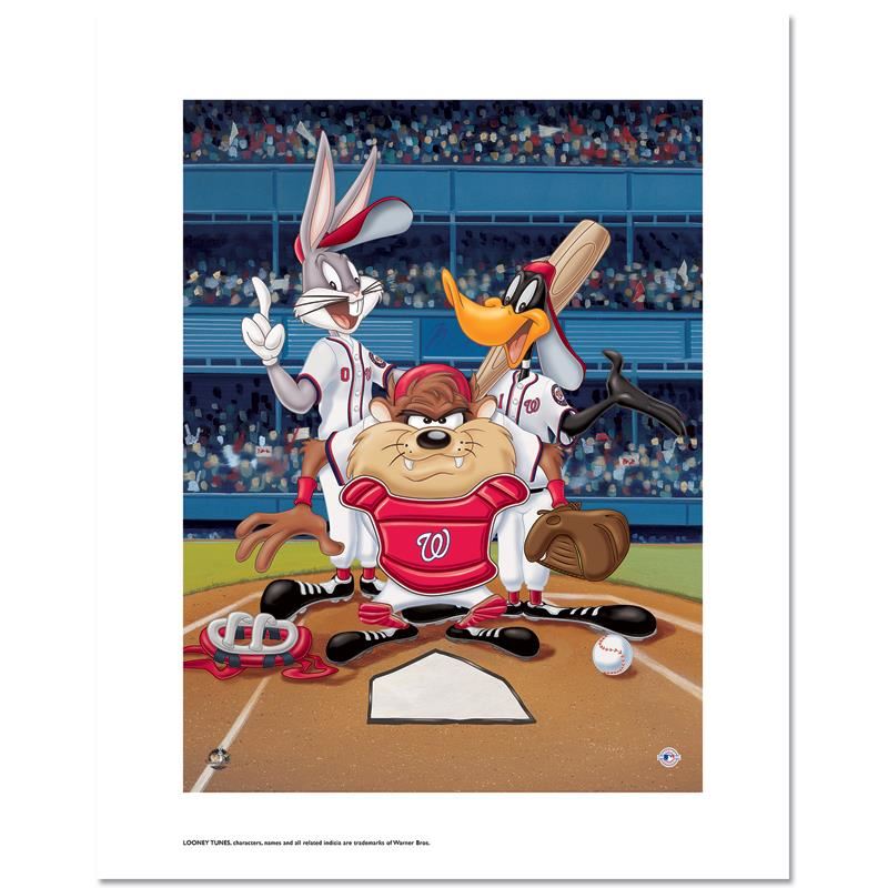 "At the Plate (Nationals)" is a limited edition giclee on paper from Warner Bros. featuring iconic Looney Tunes characters in 2019 World Series Champions, Washington Nationals MLB uniforms. It comes numbered, with hologram seal, and a Certificate of Authenticity! Measures approx. 16 x 20" (with border), 12" x 16" (image).