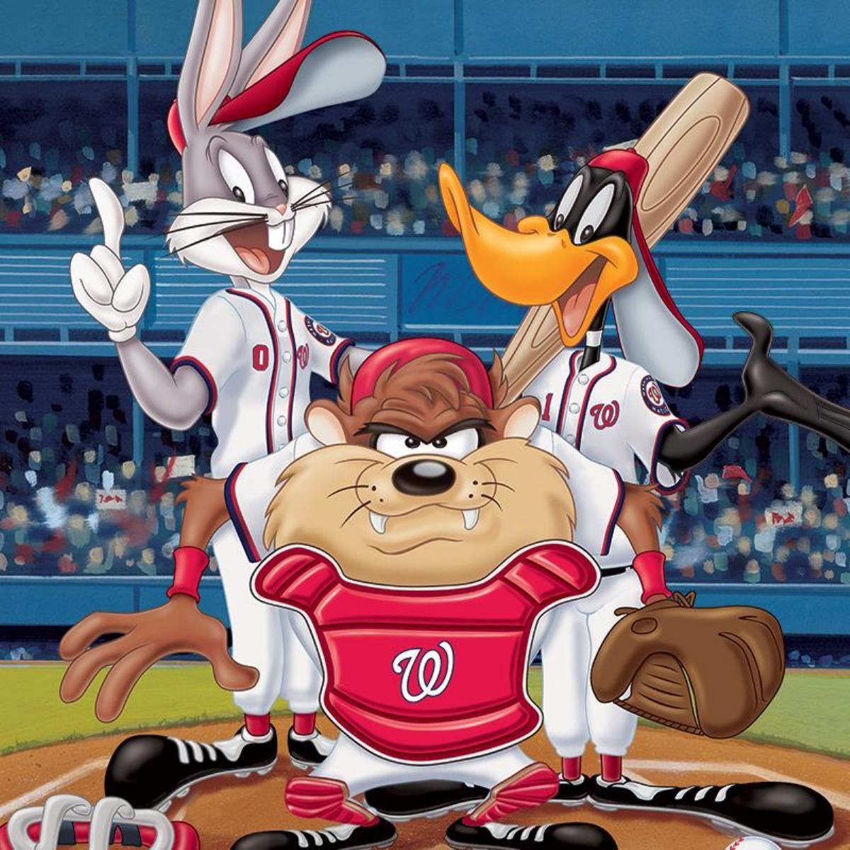 "At the Plate (Nationals)" is a limited edition giclee on paper from Warner Bros. featuring iconic Looney Tunes characters in 2019 World Series Champions, Washington Nationals MLB uniforms. It comes numbered, with hologram seal, and a Certificate of Authenticity! Measures approx. 16 x 20" (with border), 12" x 16" (image).