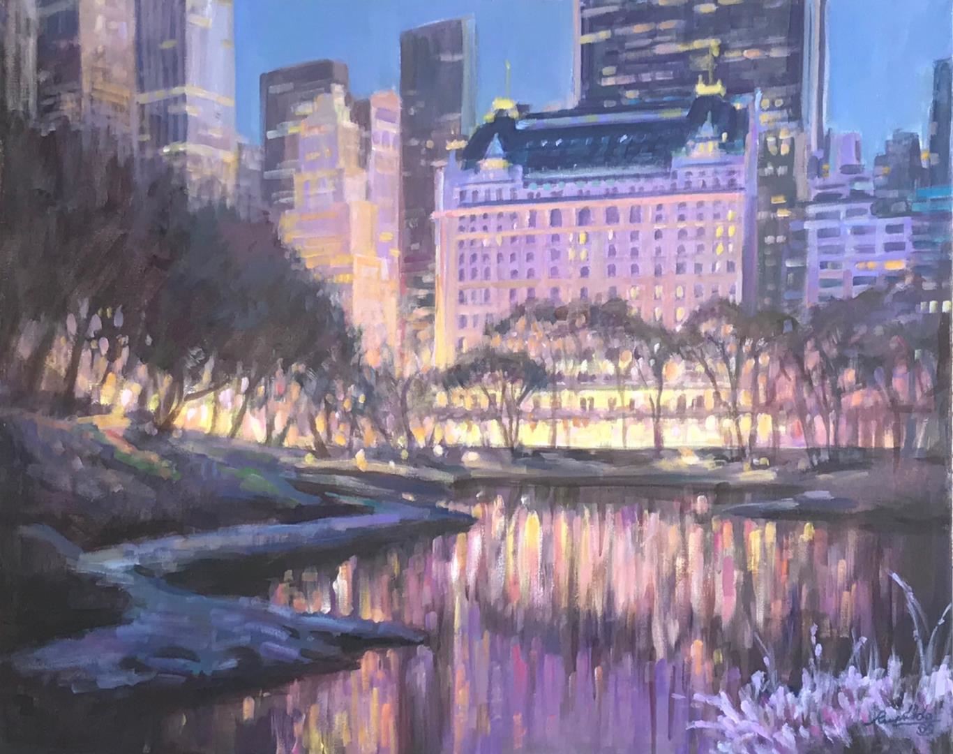A beautiful 24x30" original acrylic on stretched canvas by Richard Ho depicts the glory of the Plaza Hotel at night. W.COA