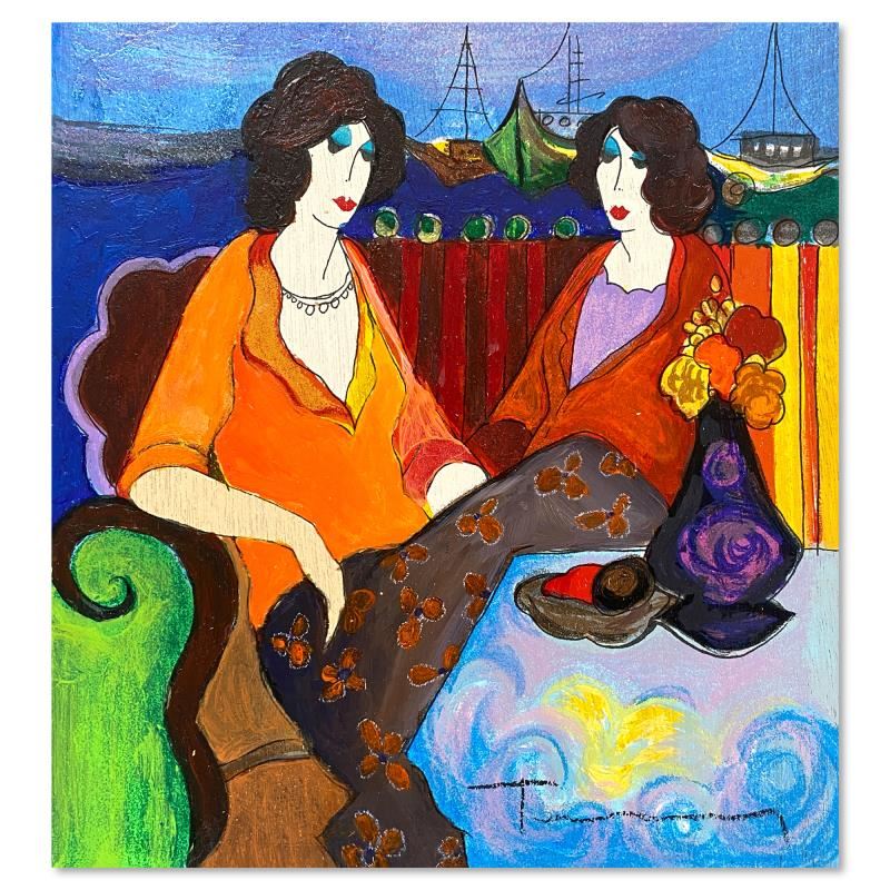 "At the Port" is a one-of-a-kind mixed media over paint on wood by Itzchak Tarkay (1935-2012), hand signed by the artist. Includes Letter of Authenticity. Measures approx. 9" x 8.5" (image).