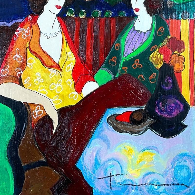 "At the Port" is a one-of-a-kind mixed media over paint on wood by Itzchak Tarkay (1935-2012), hand signed by the artist. This piece comes custom framed. Includes Letter of Authenticity. Measures approx. 17" x 16.5" (frame), 9" x 11.5" (image). This item requires special handling and may have a longer than usual turnaround.