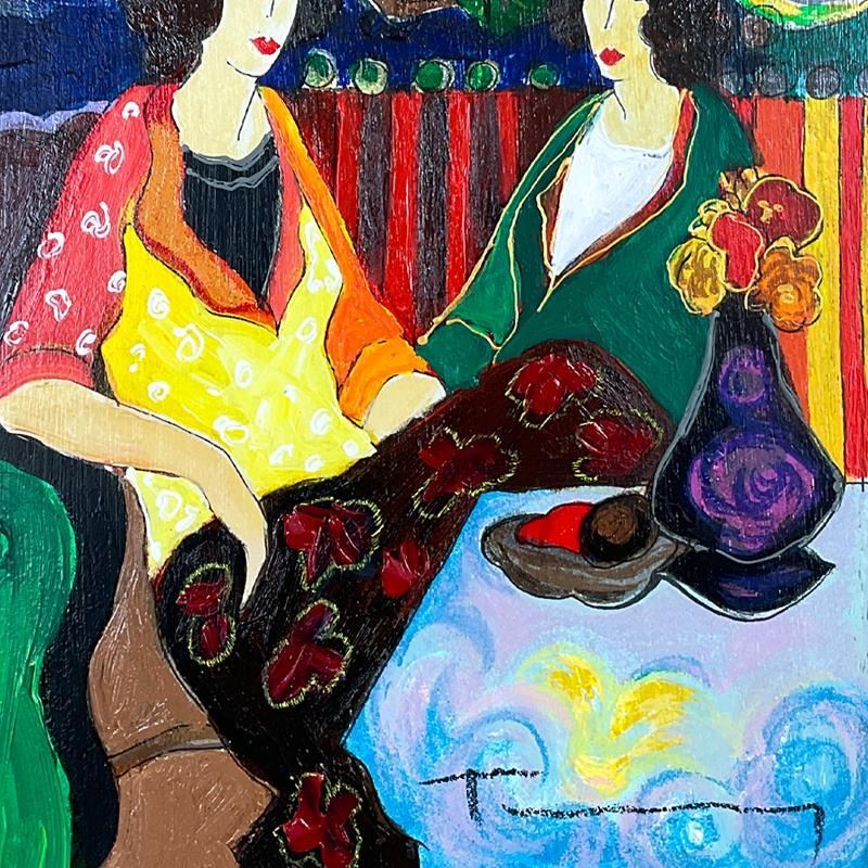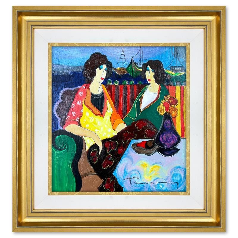 "At the Port" is a one-of-a-kind mixed media over paint on wood by Itzchak Tarkay (1935-2012), hand signed by the artist. This piece comes custom framed. Includes Letter of Authenticity. Measures approx. 17" x 16.5" (frame), 9" x 11.5" (image). This item requires special handling and may have a longer than usual turnaround.