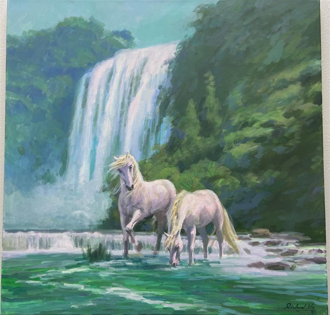 A 30x30" original acrylic on canvas by Richard Ho takes us to a tranquil canyon waterfall where the horses graze in Nature's grace.