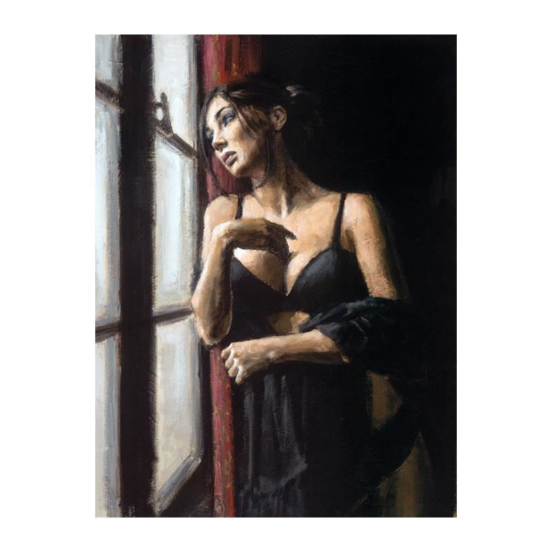 "At the Window" is a hand embellished limited edition giclee on stretched canvas by Fabian Perez. The piece is numbered and hand signed by the artist and comes with a Certificate of Authenticity. Measures approx. 16" x 12" (image). Please allow 5 additional business for items that include canvas stretch or framing.