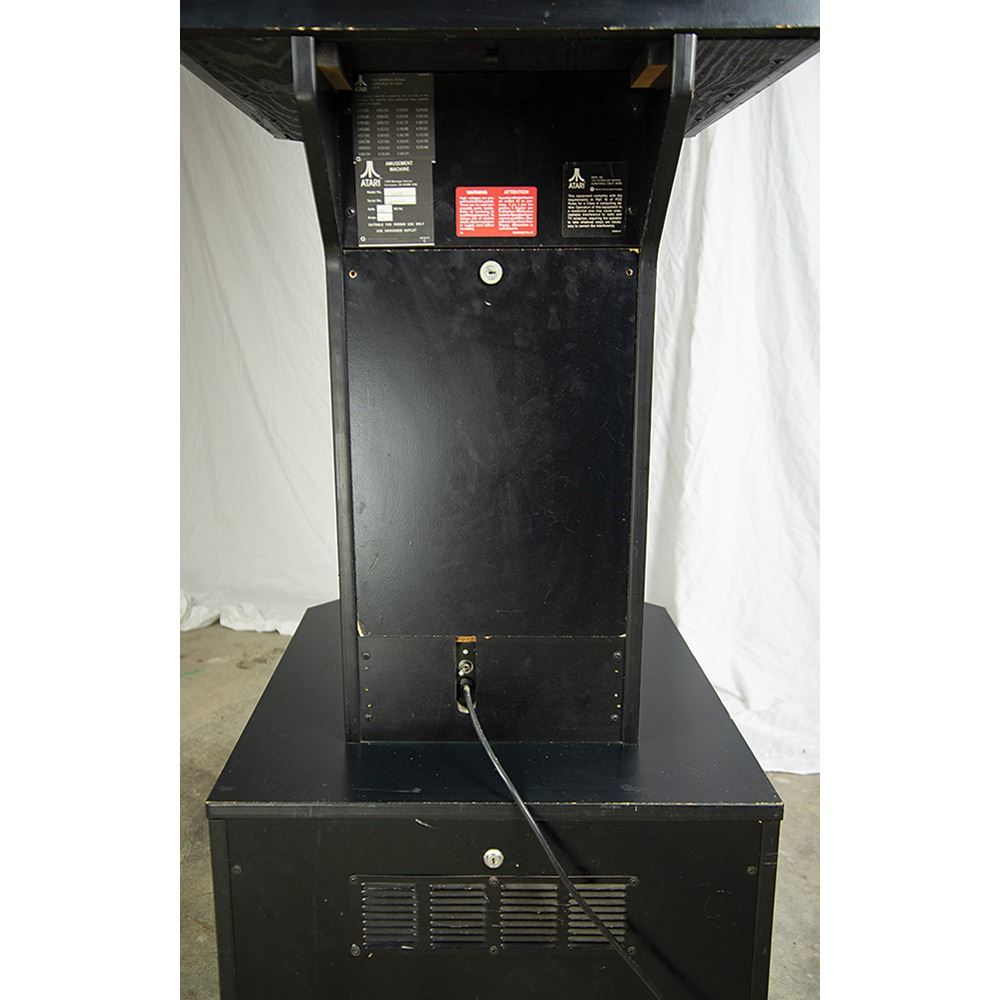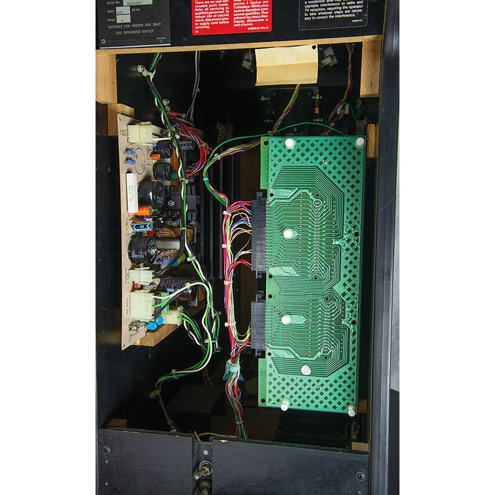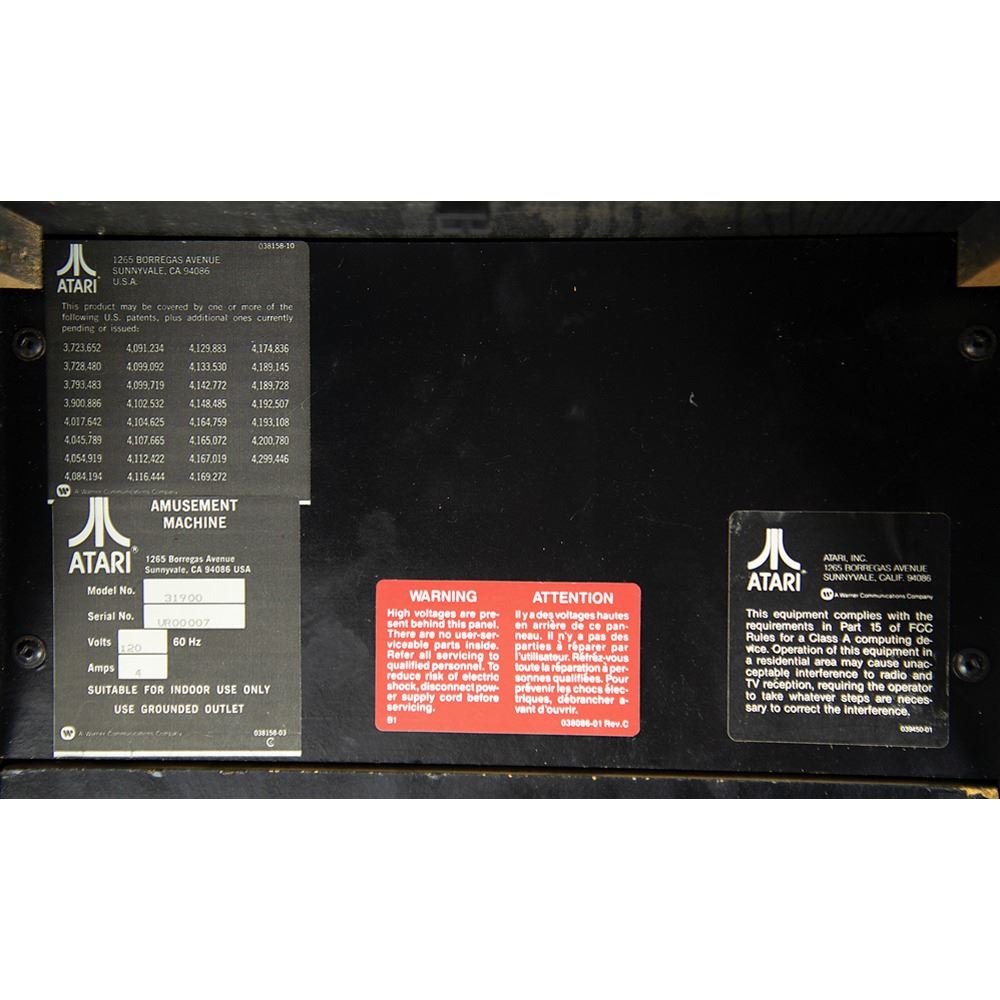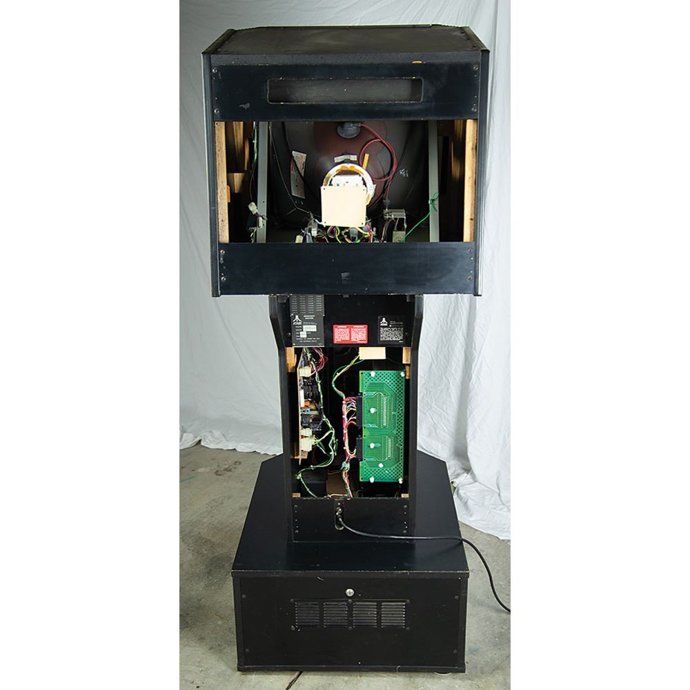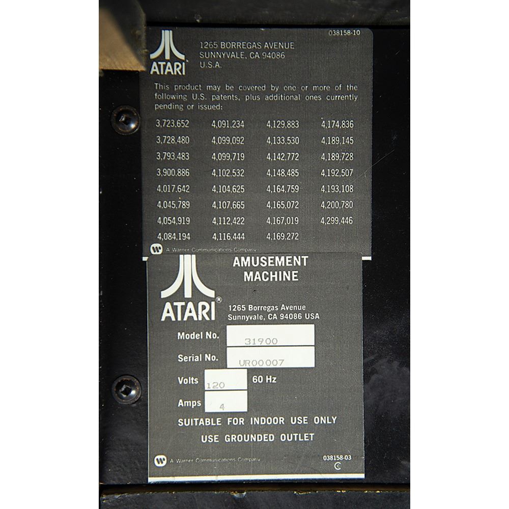 The cabinet, which measures 34.5˝ x 68.5˝ x 25.25˝, is in excellent shape, with the marquee and side art in pristine, aesthetically pleasing condition. The back of the console features its original Atari, Inc. manufacturing labels, which list the model number, “31900,” and the serial number, “UR00007.” The printed circuit board (PCB) has “UR0021” stickers and there are some wire-wrap wire prototype mods on the boards; several are not production proms, but they work for the production gameplay. All of the parts are original and were never replaced; the PBC set and cabinet have been together since 1984.