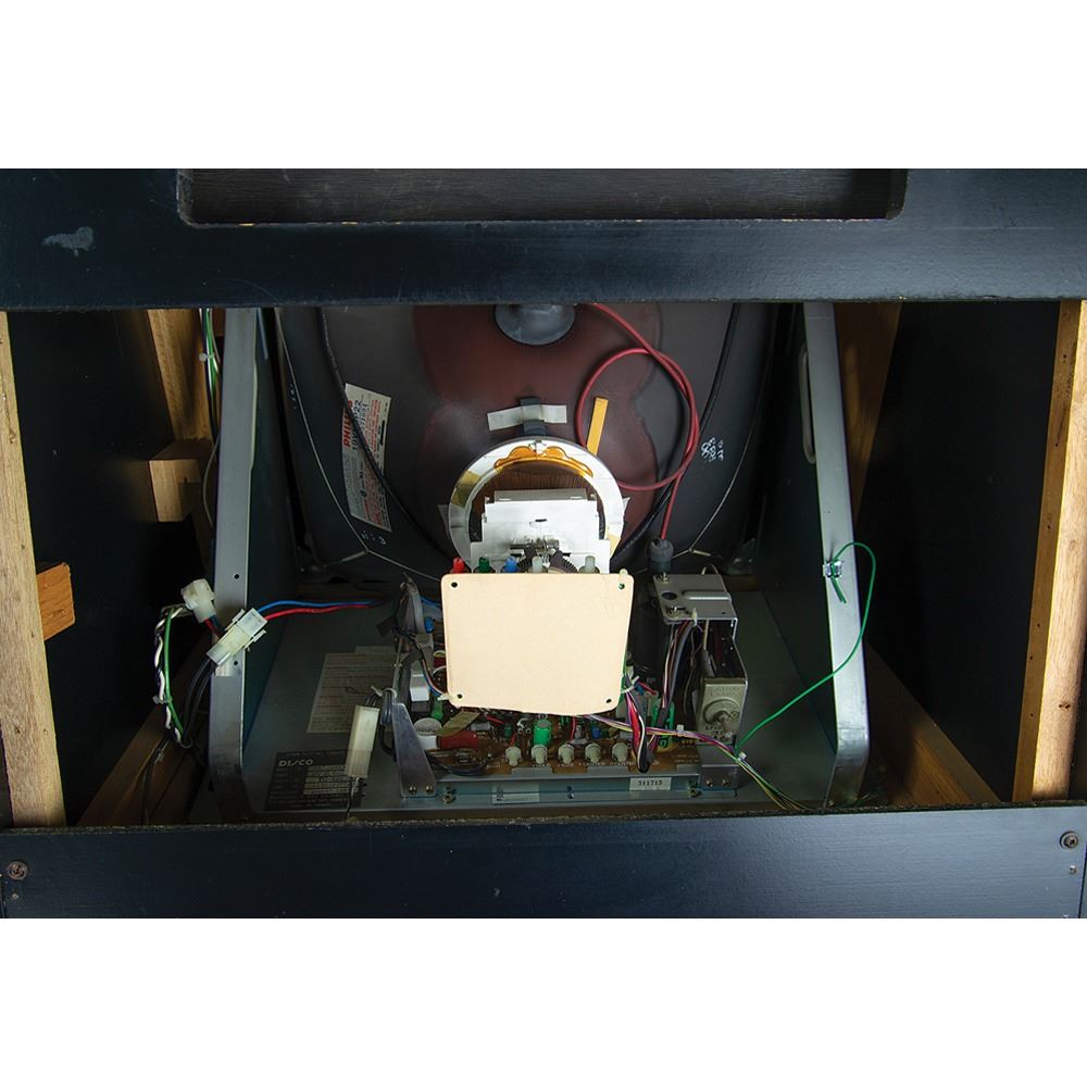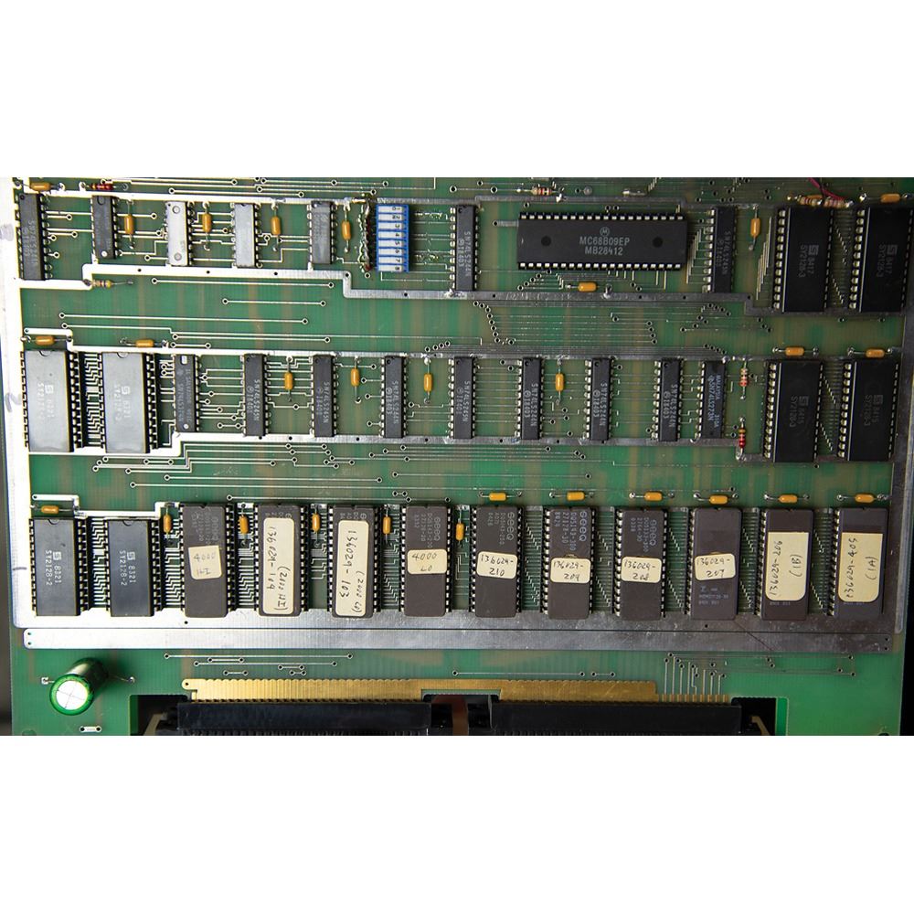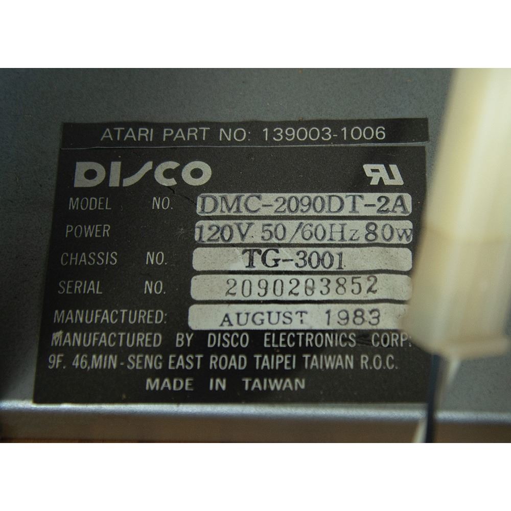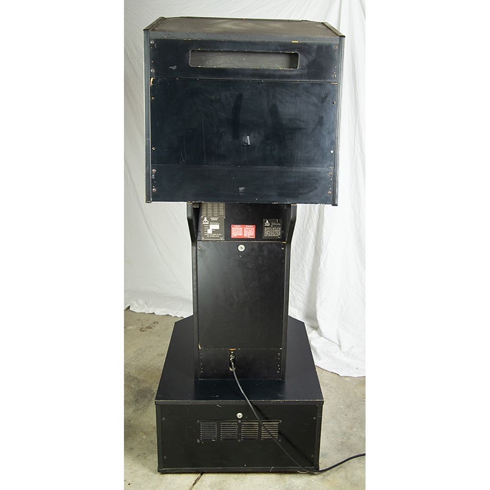 The cabinet, which measures 34.5˝ x 68.5˝ x 25.25˝, is in excellent shape, with the marquee and side art in pristine, aesthetically pleasing condition. The back of the console features its original Atari, Inc. manufacturing labels, which list the model number, “31900,” and the serial number, “UR00007.” The printed circuit board (PCB) has “UR0021” stickers and there are some wire-wrap wire prototype mods on the boards; several are not production proms, but they work for the production gameplay. All of the parts are original and were never replaced; the PBC set and cabinet have been together since 1984.