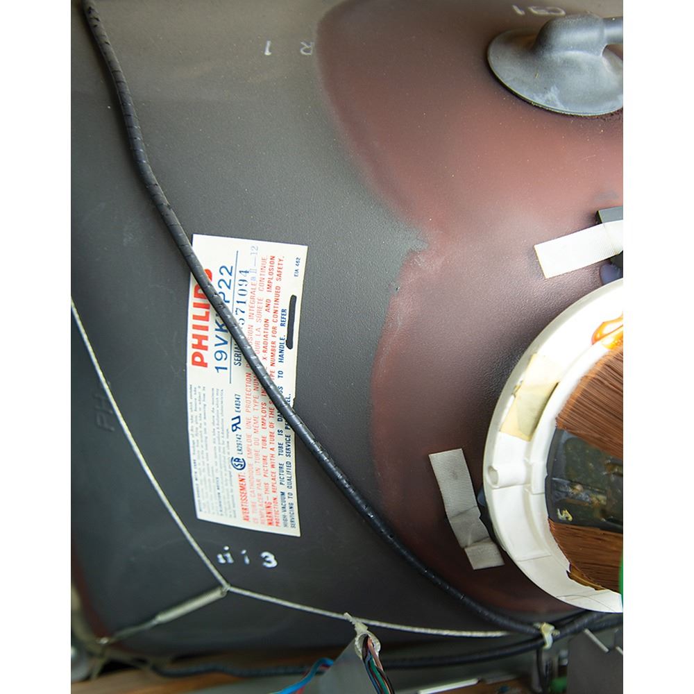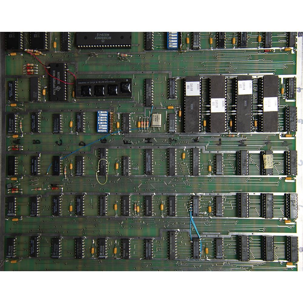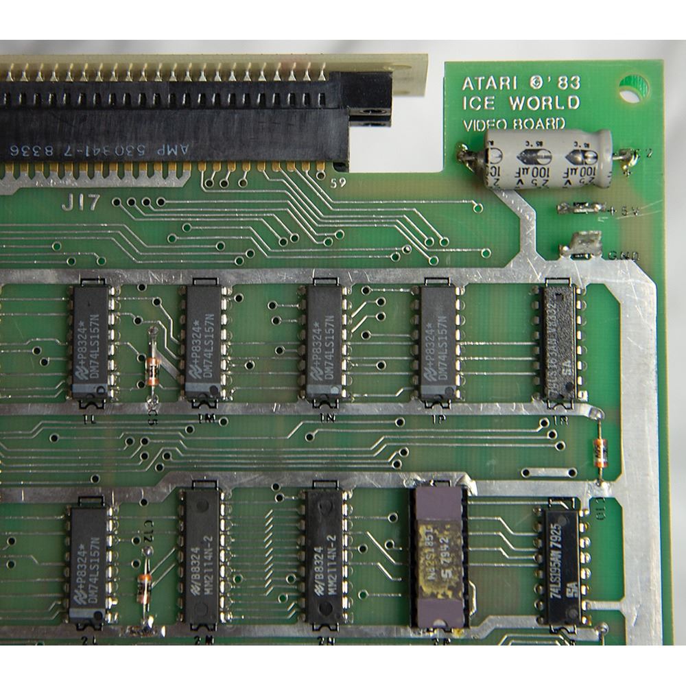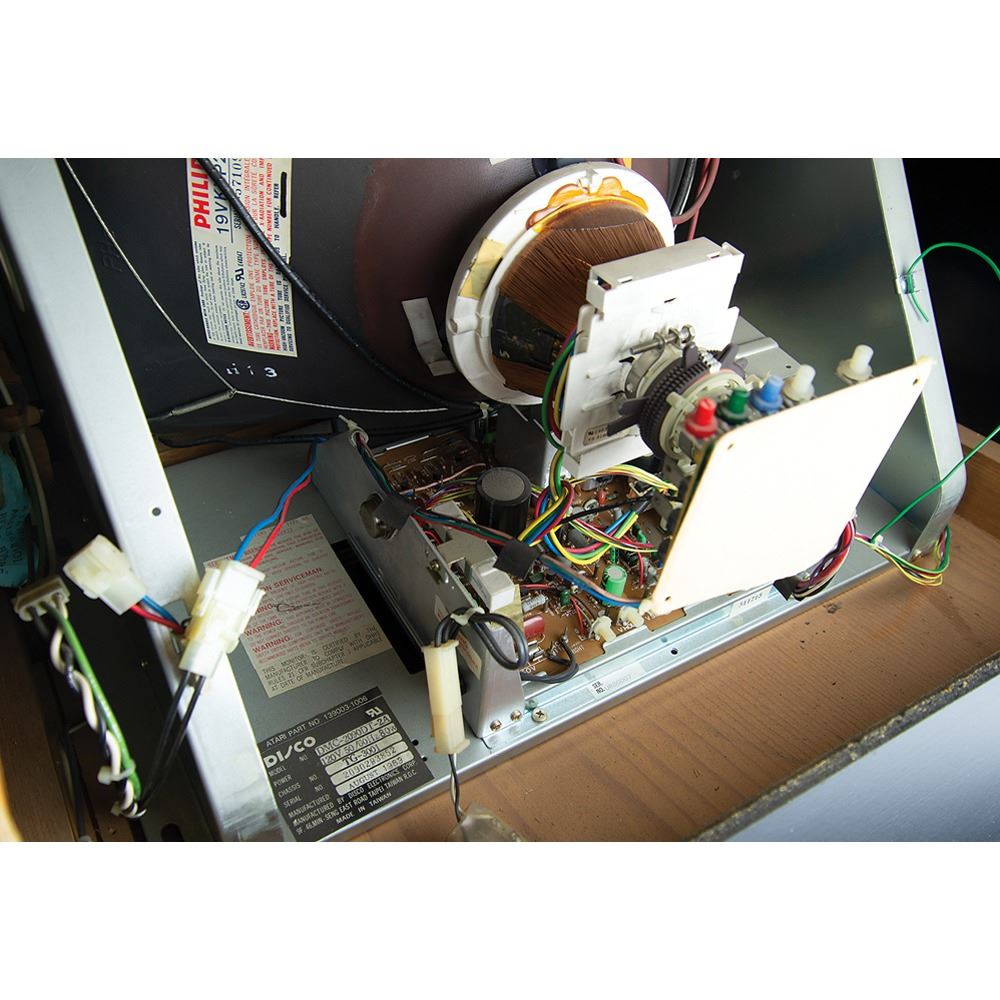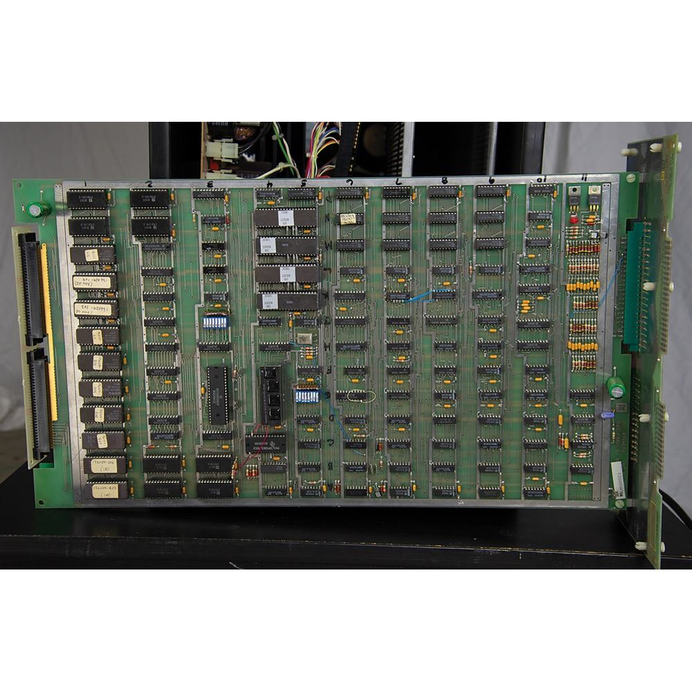 The cabinet, which measures 34.5˝ x 68.5˝ x 25.25˝, is in excellent shape, with the marquee and side art in pristine, aesthetically pleasing condition. The back of the console features its original Atari, Inc. manufacturing labels, which list the model number, “31900,” and the serial number, “UR00007.” The printed circuit board (PCB) has “UR0021” stickers and there are some wire-wrap wire prototype mods on the boards; several are not production proms, but they work for the production gameplay. All of the parts are original and were never replaced; the PBC set and cabinet have been together since 1984.