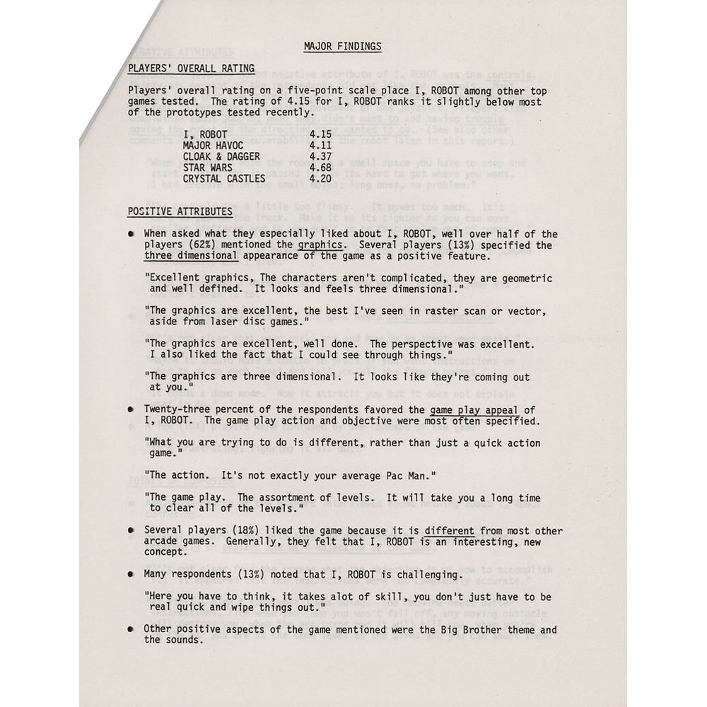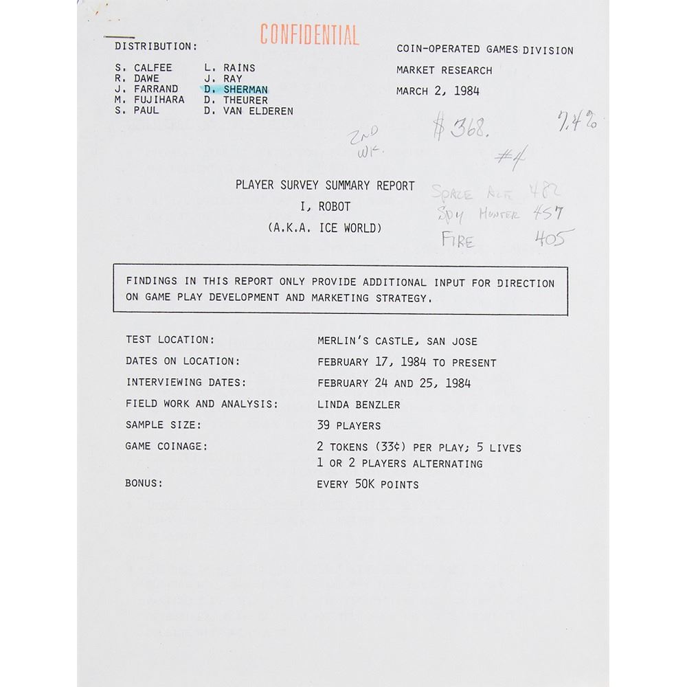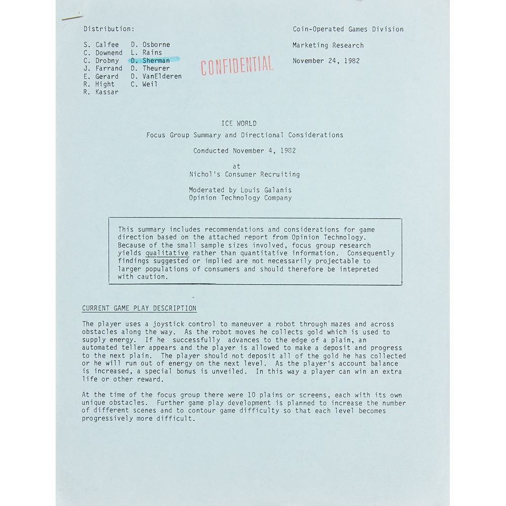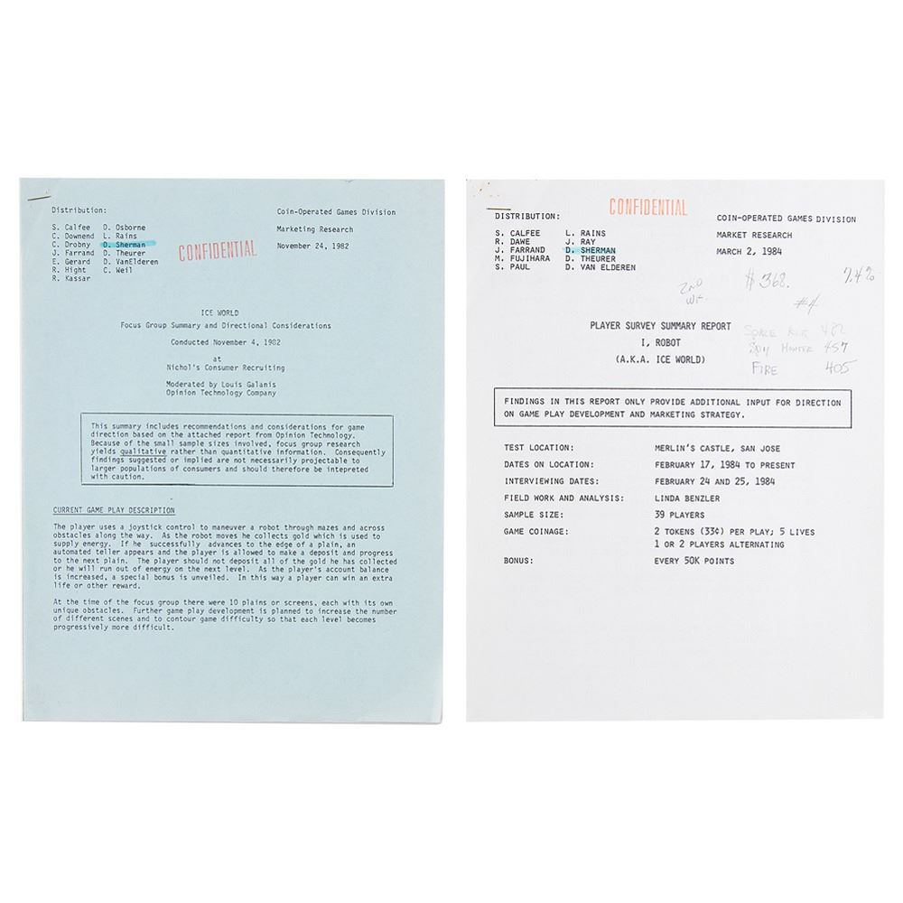 Two early stapled Atari, Inc. focus group / player survey summary reports for ‘Ice World,’ the development code name for the innovative arcade shooter game I, Robot, which derived from the personal collection of Atari hardware designer David Sherman. Both reports are stamped as “Confidential” and were organized by Atari’s Coin-Operated Games Division for “Marketing Research.”