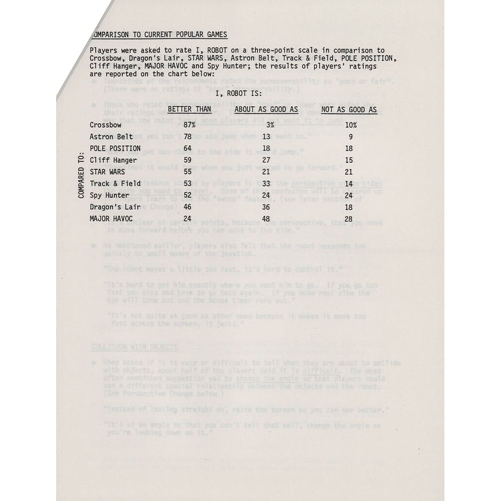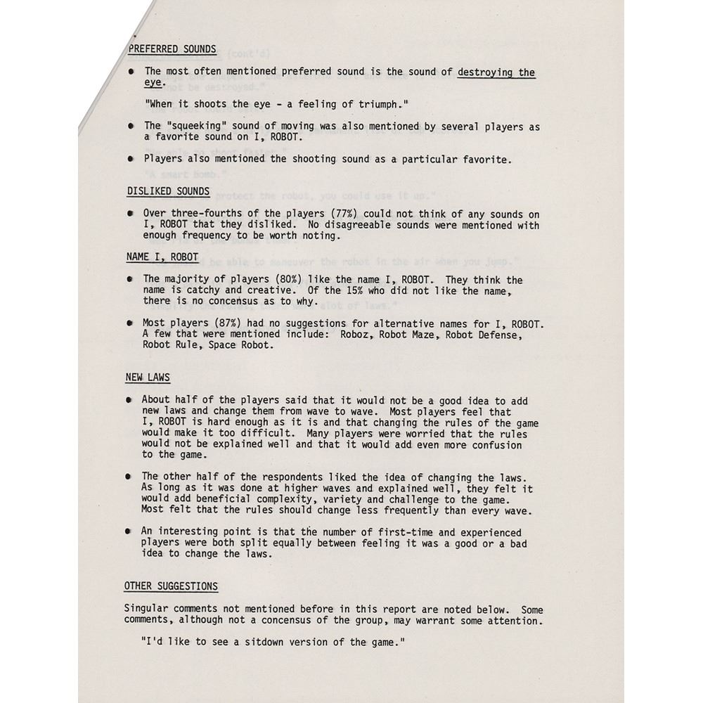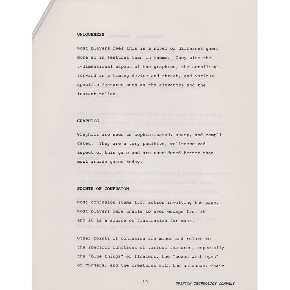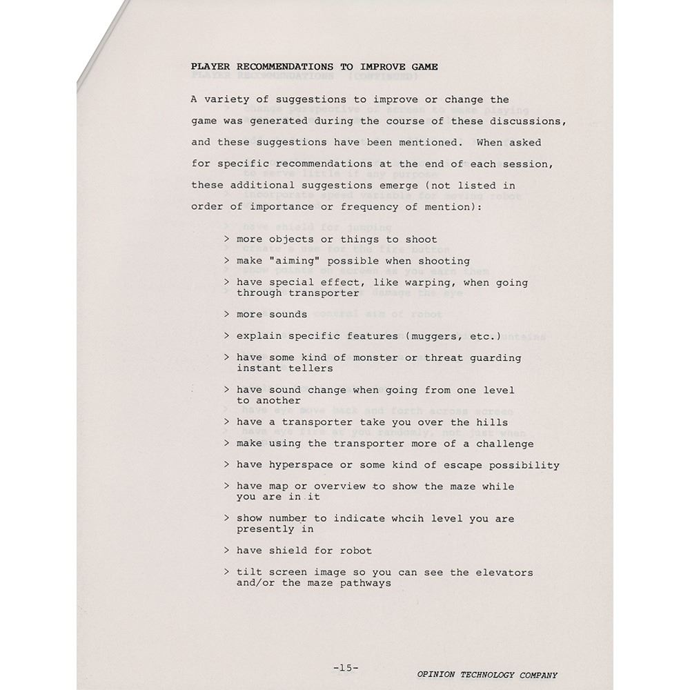 The second report was conducted on February 17, 1984, at Merlin’s Castle in San Jose, California, where the game “was observed for a total of nine and one-half hours during times of high player traffic. Game times were recorded for 63 games observed on Saturday. A total of 39 interviews were completed.” Similar to the earlier report, both positive and negative attributes were recorded, as were areas like points of confusion, action and variety, boring aspects, likelihood to play again, comparisons to current popular games, and more. Also included is an Atari schematic entitled “Project Development Flow Chart Draft.”