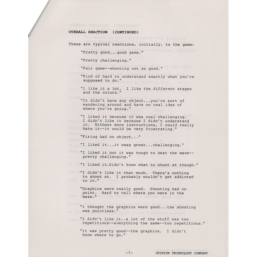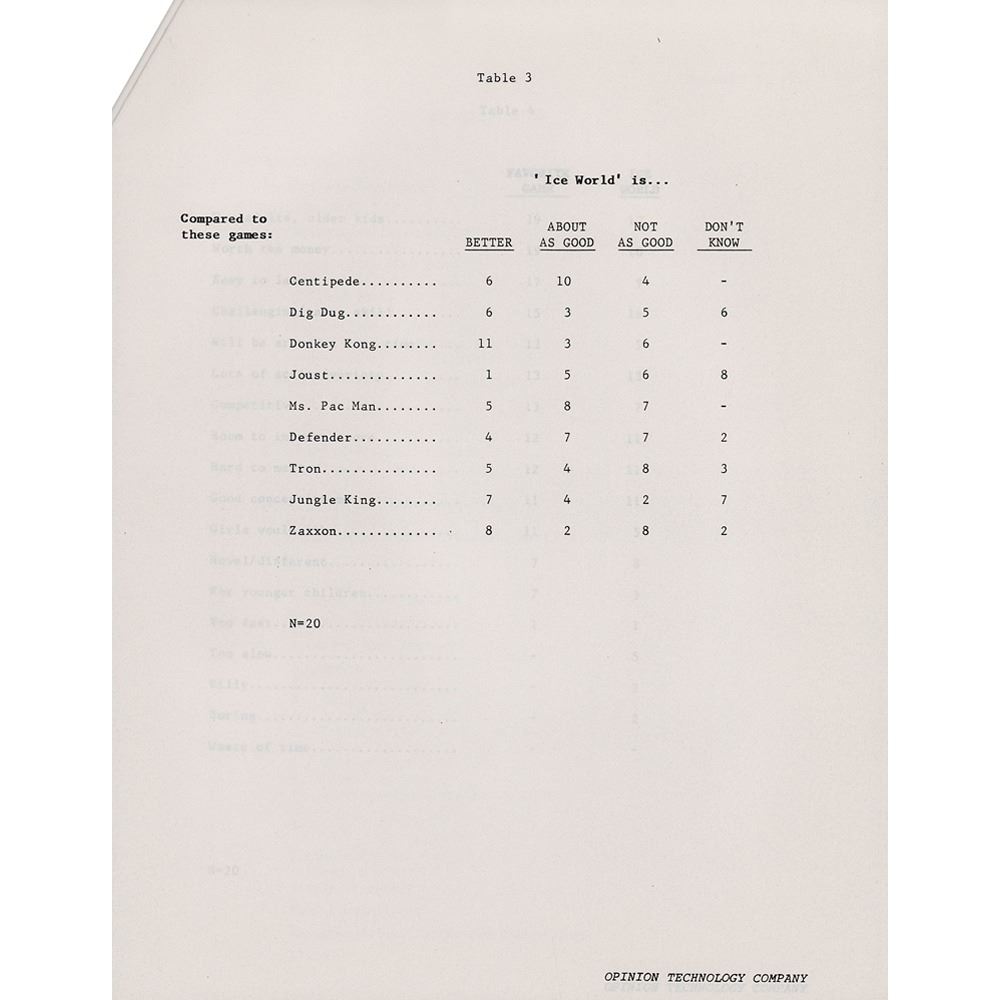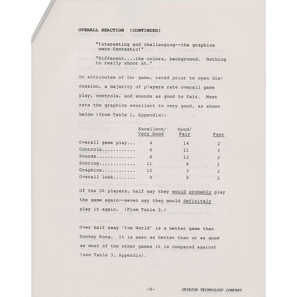 The earlier report, conducted on November 4, 1982, at Nichol’s Consumer Recruiting, summarizes the findings of two focused research groups in order to obtain initial player reaction to ‘Ice World’ among frequent arcade video game players in Santa Clara County. The first group consisted of younger players, aged 15 to 19, and the second group consisted of players over 20 years old. This earlier report is thus much more comprehensive and contains several sections related to the player experience and their initial thoughts and suggestions, touching on aspects like game concept, uniqueness, graphics, points of confusion, and more.