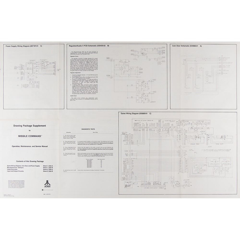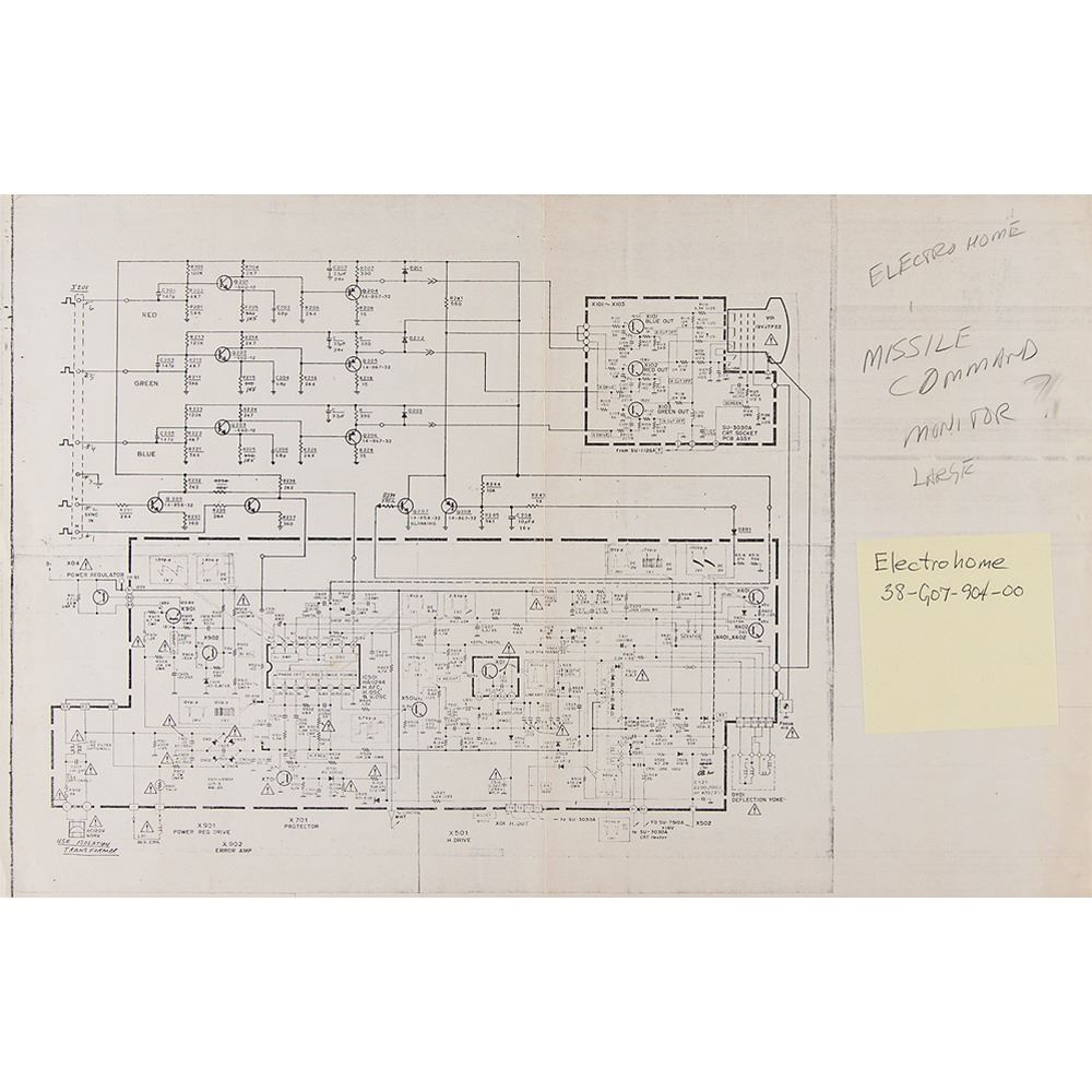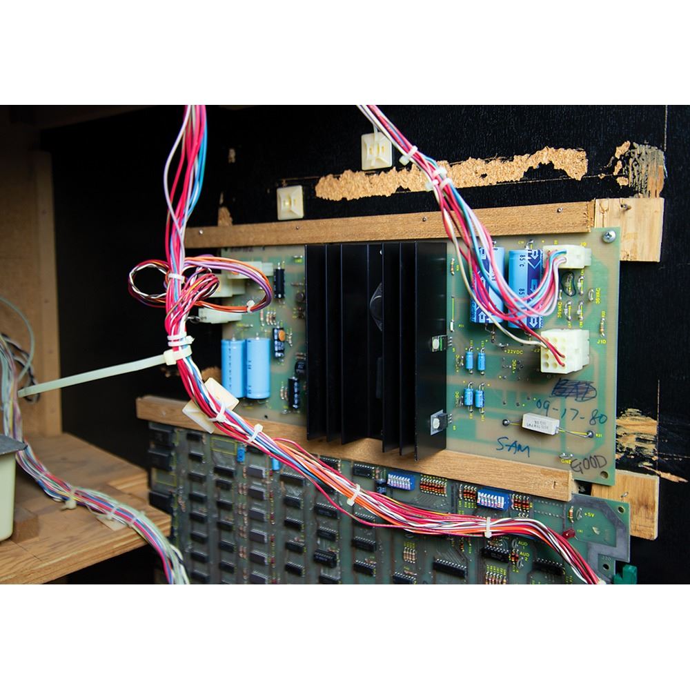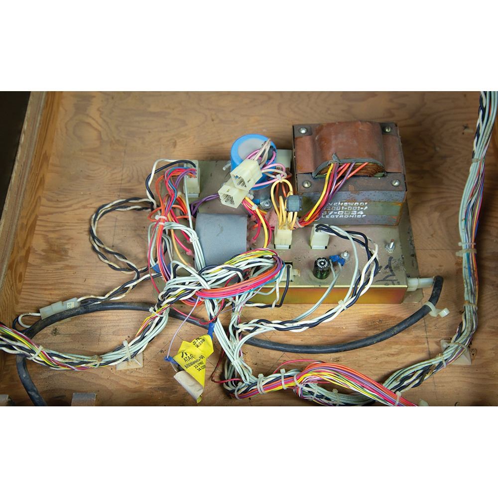 The cabinet, which measures 30.25˝ x 65˝ x 25.25˝, and the printed circuit board (PCB) have been together since 1980, with minimal PCB and power supply parts replaced to keep the game running; the PCB was one of the ‘first articles’ signed off on for full production. An interior Electrohome label is marked: 19˝ COL GAM MNT, Product No. 38-G07904-00, Serial No. 9-254941, August 11, 1980. The video display quality is very crisp. As befits its origin as a lab cabinet, the side graphics, which are typically seen on a production unit, are not present. The game is accompanied by its original ‘Drawing Package Supplement,’ which consists of operator schematics and service documents.