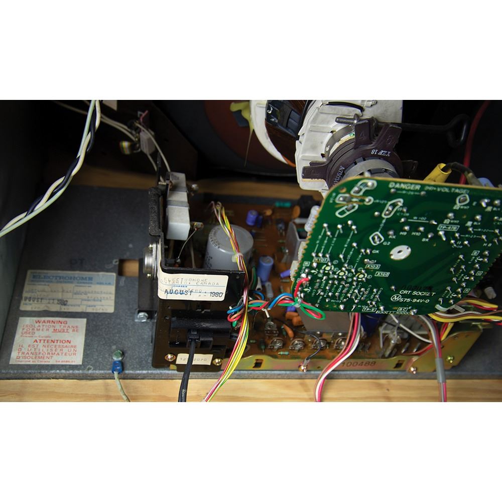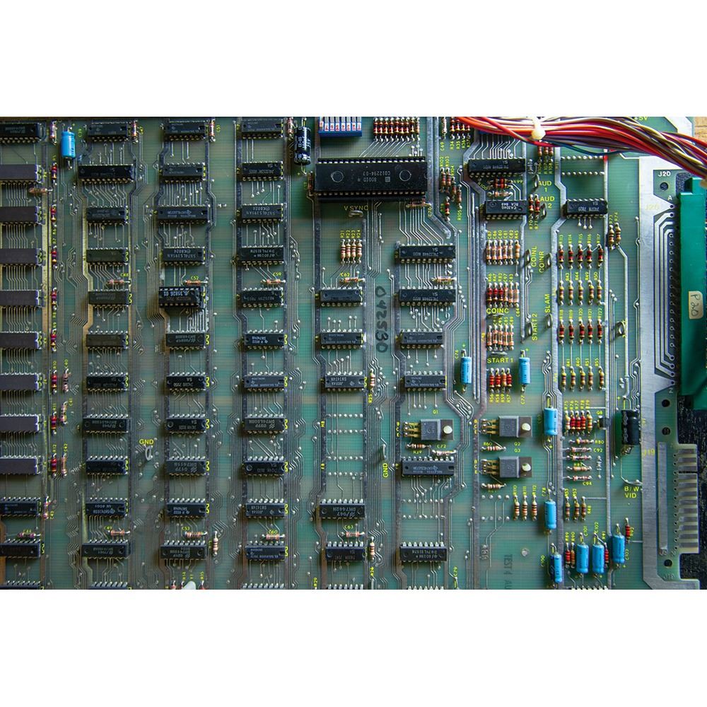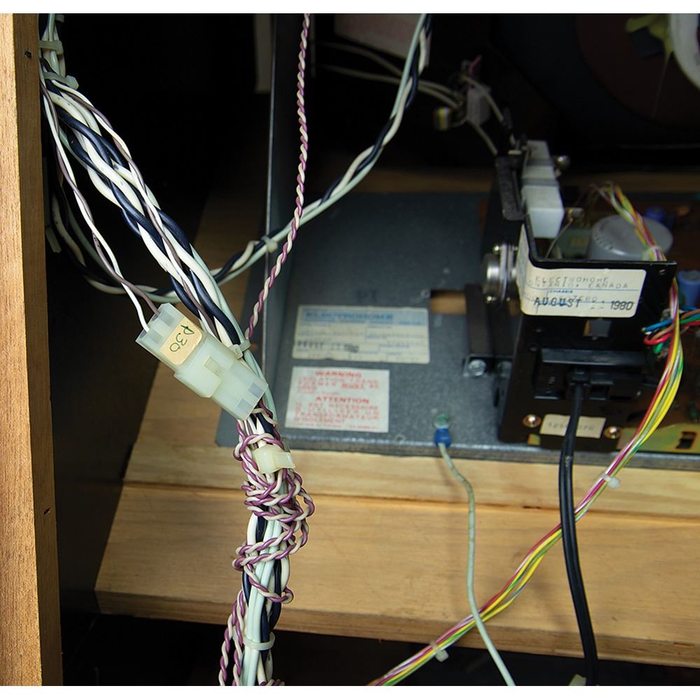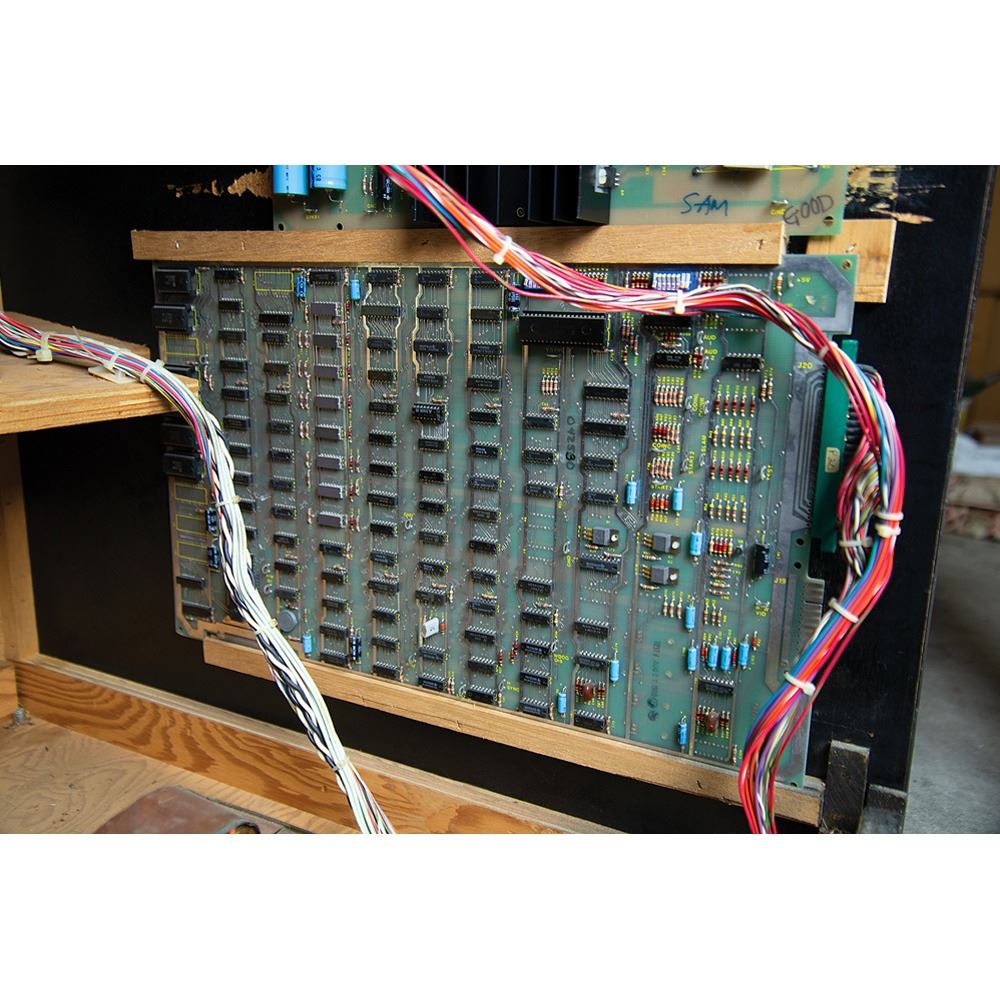 The cabinet, which measures 30.25˝ x 65˝ x 25.25˝, and the printed circuit board (PCB) have been together since 1980, with minimal PCB and power supply parts replaced to keep the game running; the PCB was one of the ‘first articles’ signed off on for full production. An interior Electrohome label is marked: 19˝ COL GAM MNT, Product No. 38-G07904-00, Serial No. 9-254941, August 11, 1980. The video display quality is very crisp. As befits its origin as a lab cabinet, the side graphics, which are typically seen on a production unit, are not present. The game is accompanied by its original ‘Drawing Package Supplement,’ which consists of operator schematics and service documents.