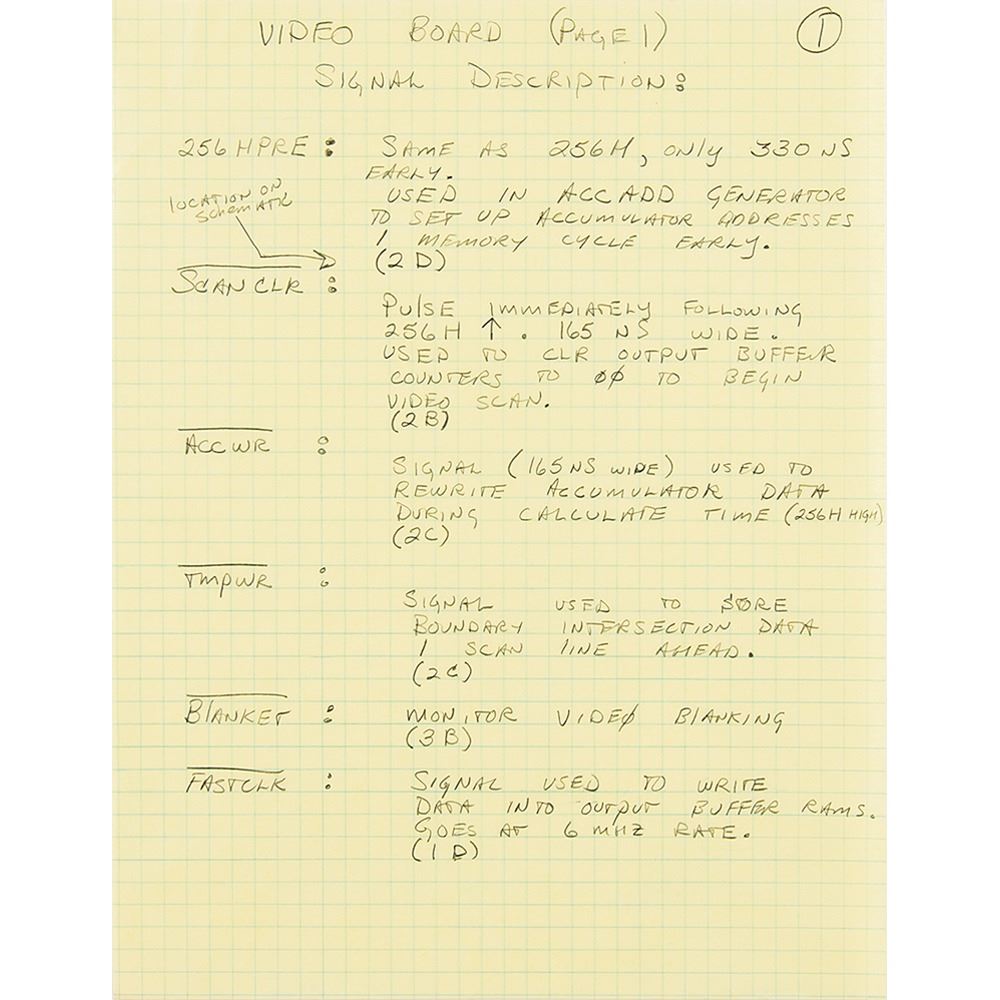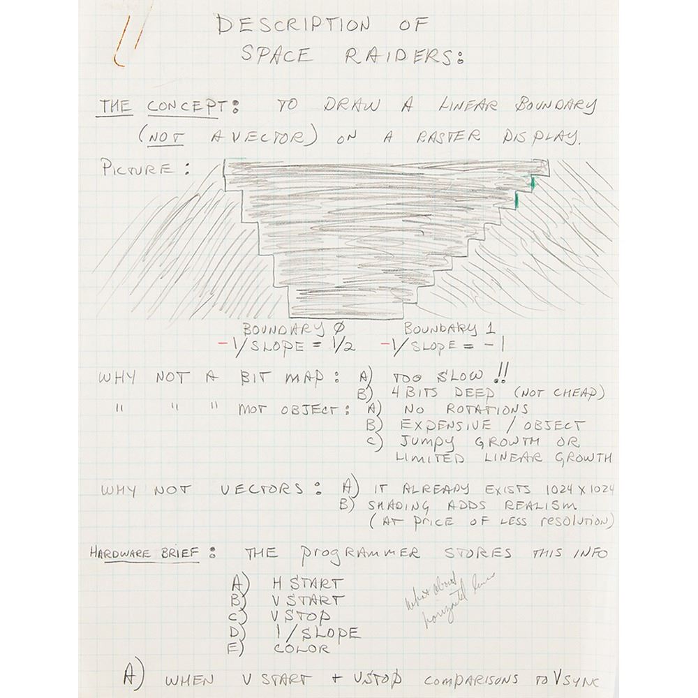- An 11-page handwritten “Description of Space Raiders” packet, which Sherman recalls: ‘An original for an earlier version of the idea attached to a simple game idea called Space Raiders. I think the game was a first-person ‘Asteroids’ idea on a raster screen, so the extremely limited hardware could have been justified. The idea was dropped even though the game idea lived on and was used in some documentation.’