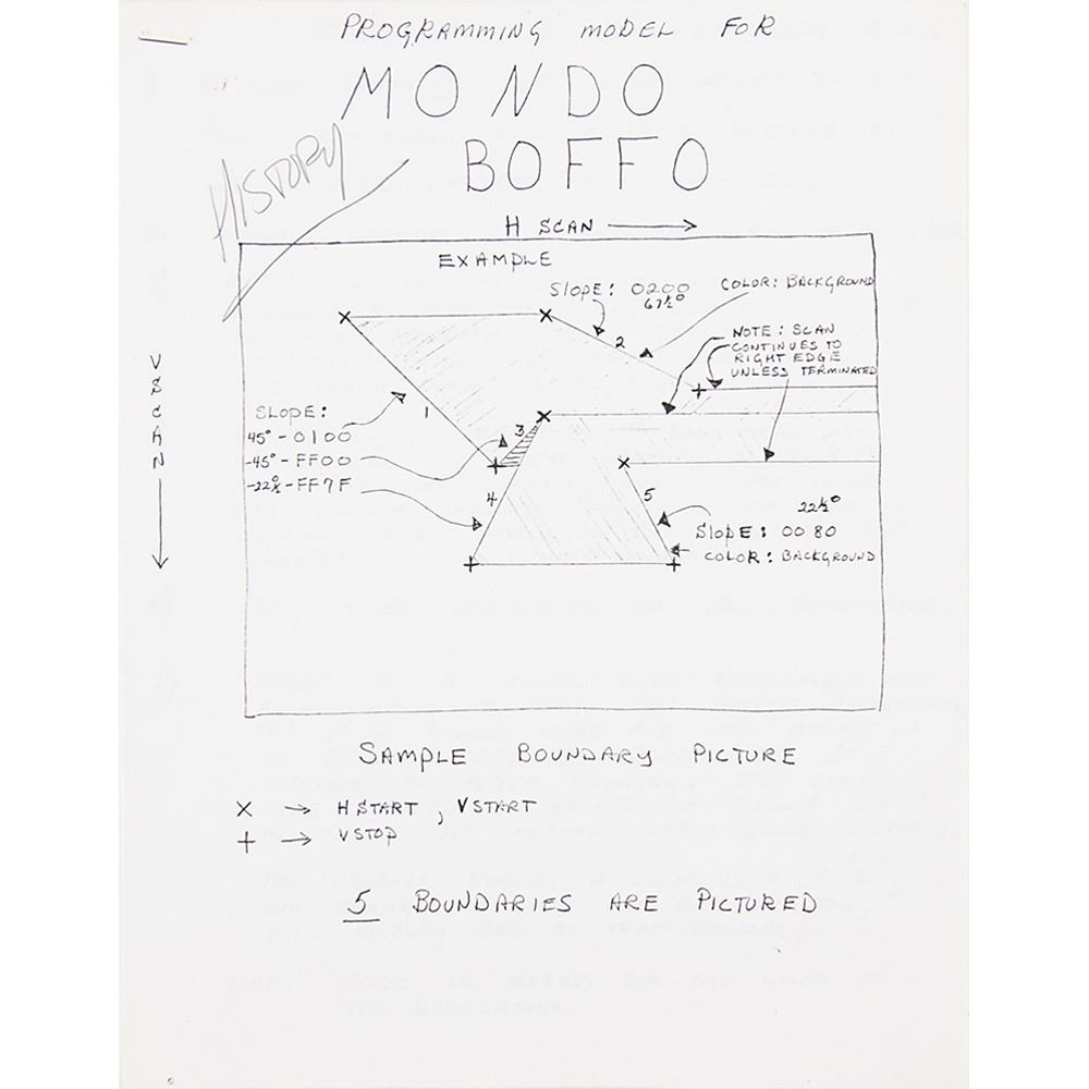 - A 5-page programming model packet for Mondo Boffo, featuring basic features distributed to a few programmers for comment; a simple write-up of accumulated boundary coordinates to delineate color regions