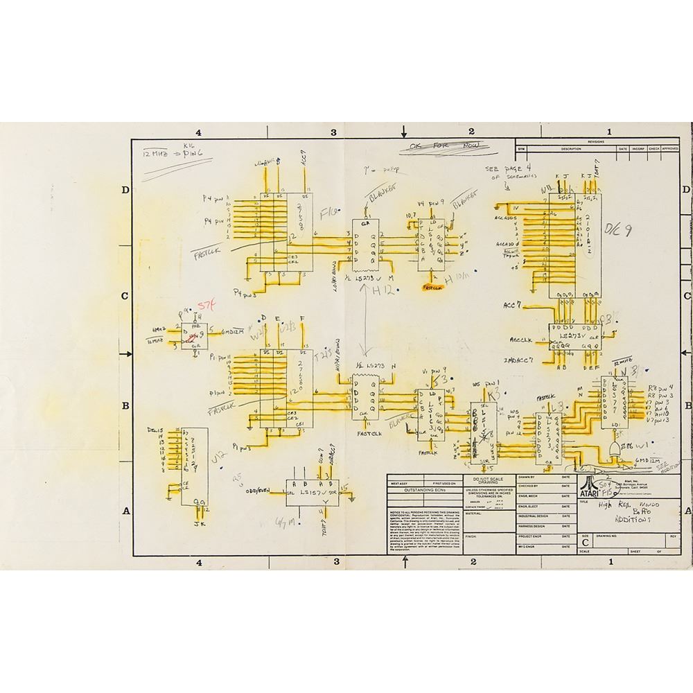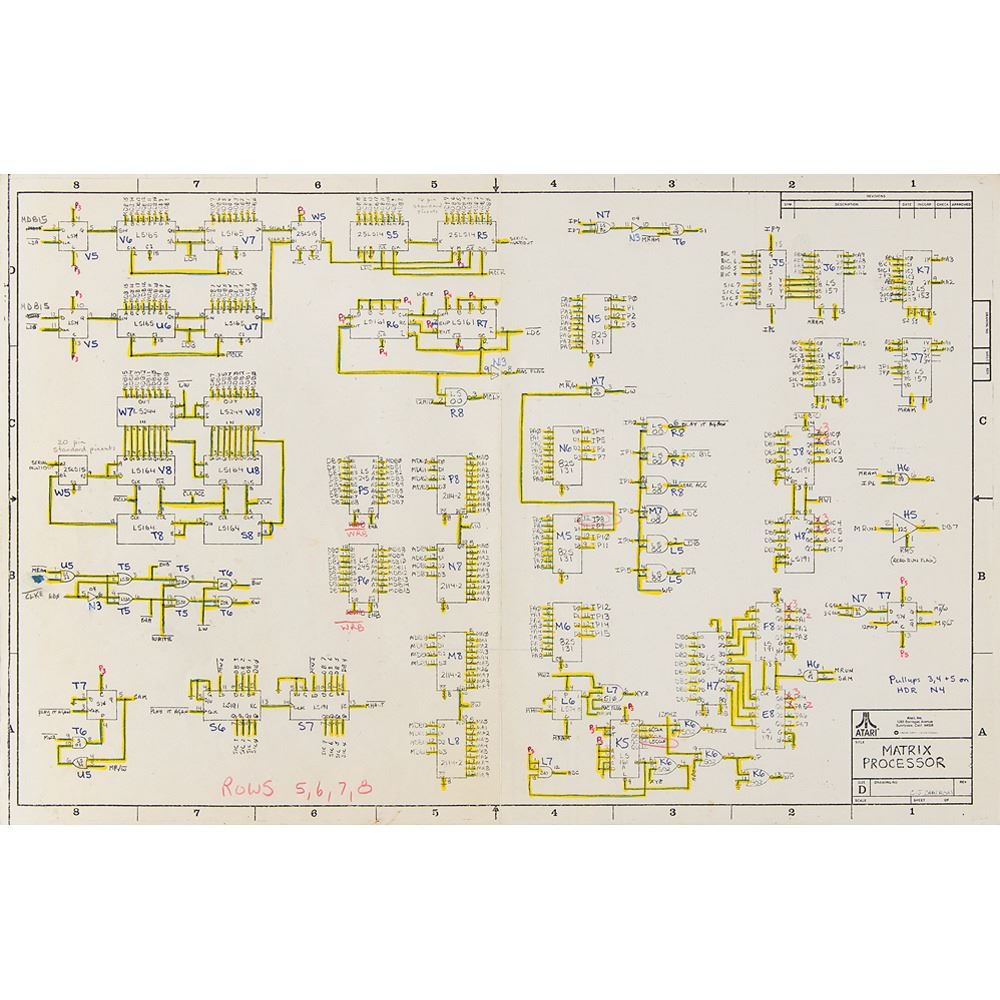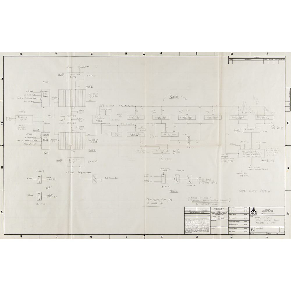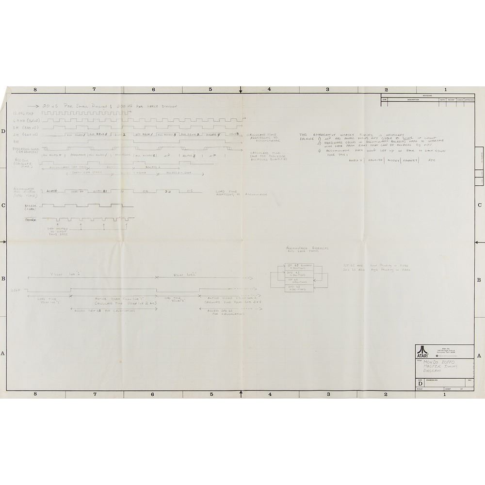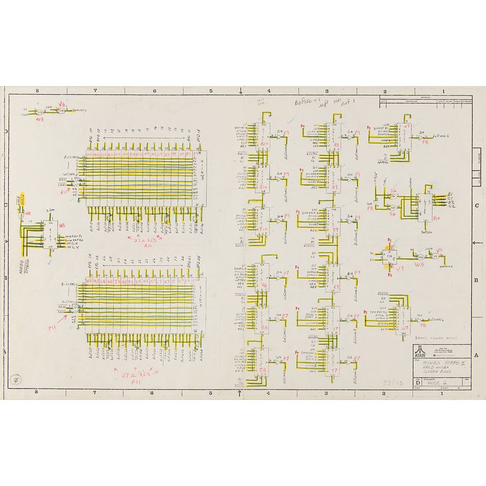Extensive archive of development material related to the Atari, Inc. video processor project ‘Mondo Boffo’ and the 3-D processor project ‘Mondo Bondo,’ deriving from the personal collection of hardware designer David Sherman, who worked on these processors between 1980 and 1983 during Atari’s graphical evolution. The archive, which contains an abundance of schematics and hand-annotated worksheets and diagrams that Sherman used to lay the programming foundation for Atari games like Space Raiders, Blasteroids, and I, Robot, has been divided into the following bundles and binders: