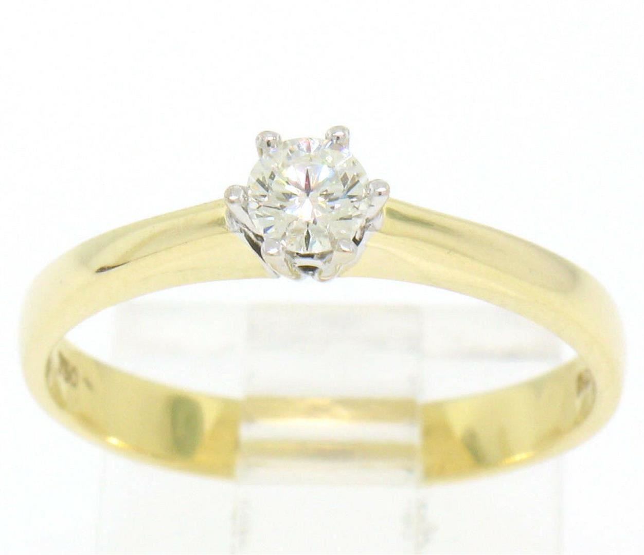 A like new 18kt yellow gold engagement ring by Atasay featuring a 0.23ct round diamond (G - VS1) prong set in 18kt white gold. The ring is size 8, weighs a total of 3.3 grams, and measures 4.64mm wide.