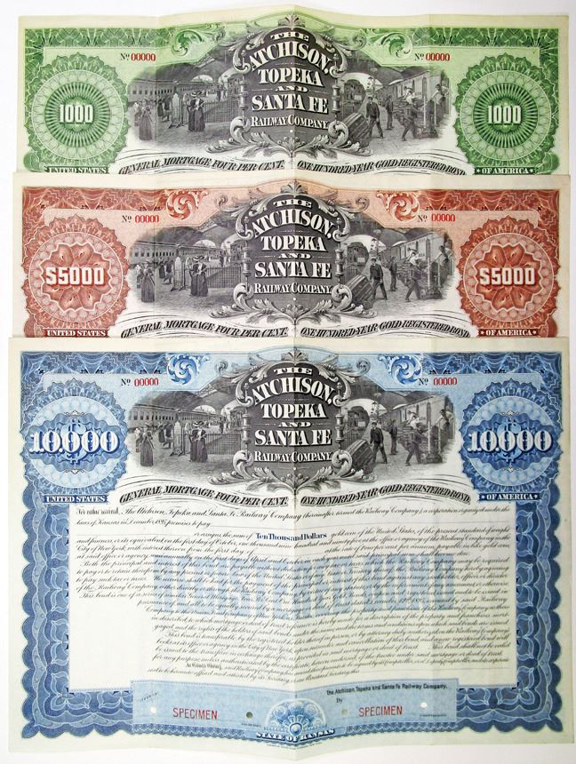 Kansas, 1895. Lot of 3 pieces, all are Specimen 4% Registered General Mortgage Gold Bonds, Includes: $1000 in green; $5000 in brown; and $10,000 in blue. All have red specimen overprints, 00000 serial numbers, and POCs. VF condition, ABNC. (3)