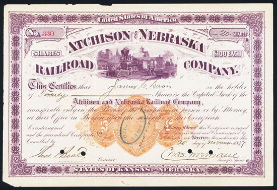 Nebraska & Kansas, 1877. Issued and punch cancelled stock certificate. 20 Shares. Purple printing. RN-U1 in middle of stock with blue ÒStamp redeemedÓ overprint. Vignette of train at station. XF condition. Unlisted stock type in Cox and new imprinted revenue find on railroad stock certificate. Hooper, Lewis & Co., Boston. Rare stock certificate.